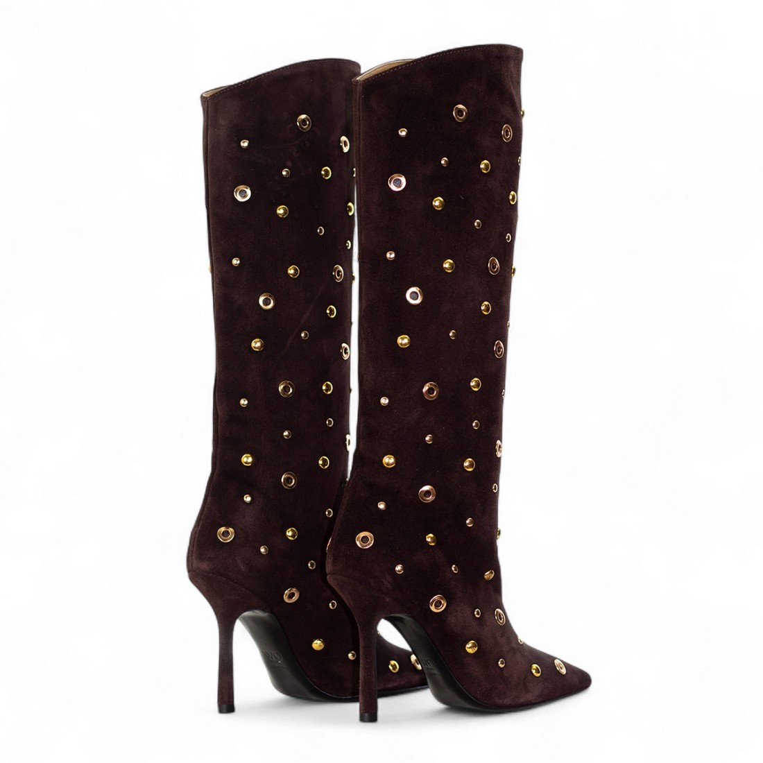 Bota larga Wo Milano en ante marrón toffee con tachuelas decorativas doradas por toda la bota. Tacón de 100 mm, suela de goma resistente y caña de 37 cm. Interior forrado en piel para mayor comodidad y calidad, ideal para un look elegante y vanguardista, perfecto para completar conjuntos glamurosos en cualquier temporada.Nuestro servicio al cliente está disponible de lunes a sábado de 10:00 a 19:30