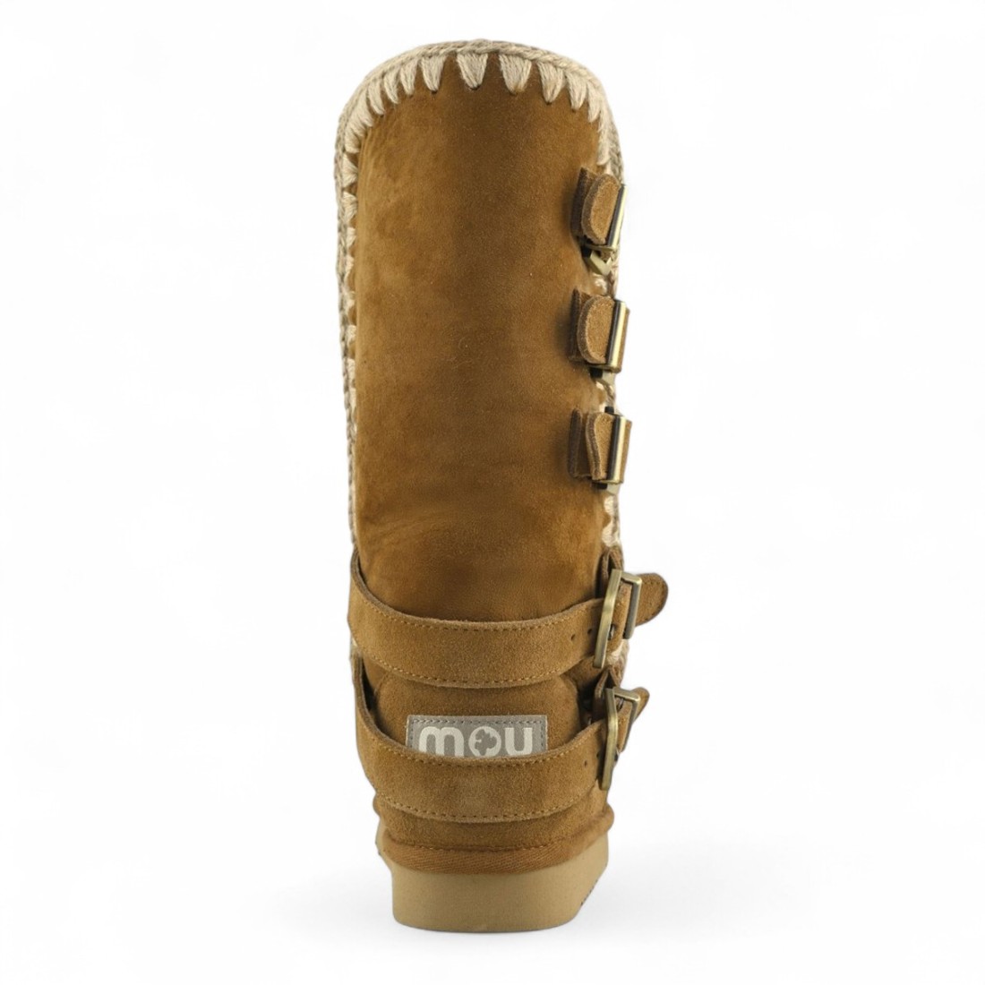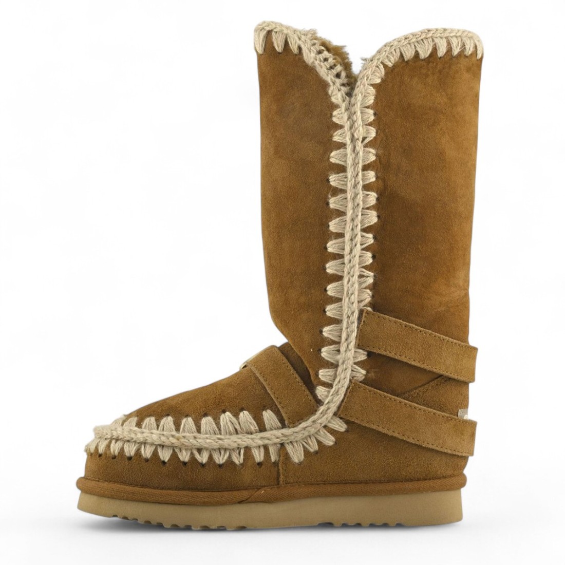 Bota Eskimo 40 Buckle Straps de MOU en ante color coñac, con correas abrochadas para un estilo moderno y sofisticado. El suave forro de piel de oveja de doble cara garantiza confort y calidez, mientras que las costuras de lana de ganchillo y la suela de goma aseguran durabilidad y calidad artesanal. Altura de 40 cm, perfectas para looks de invierno elegantes y contemporáneos.