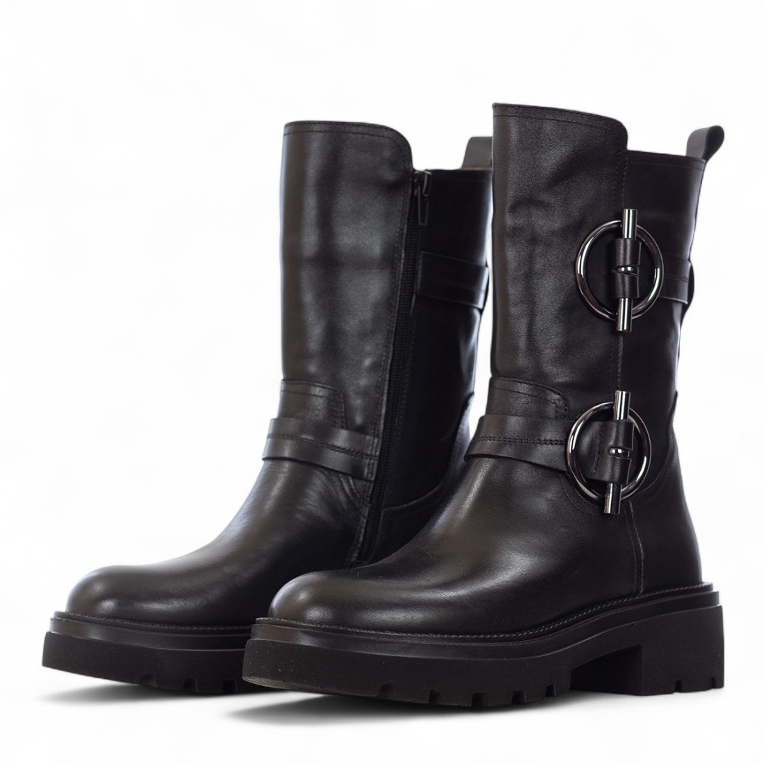 Botas ALBANO de piel negra con un carácter fuerte y refinado. El tacón de aproximadamente 55 mm ofrece comodidad y estilo, mientras que las correas con detalles tono sobre tono añaden un toque de glamour. La cremallera lateral garantiza un ajuste práctico. Forro y plantilla de piel y textil para un confort ideal, suela de caucho para una pisada segura. Perfectas para un look elegante y original.