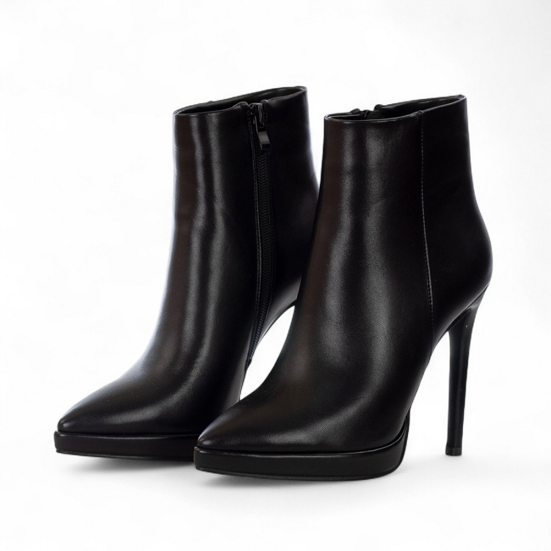Botín EXÉ de piel sintética negra con cremallera lateral funcional, ideal para un look moderno y versátil. Tacón bajo de 12 mm con plataforma de 20 mm para el máximo confort, suela de goma antideslizante y forro de piel sintética. Perfectos para combinar estilo y practicidad en días dinámicos.Nuestro servicio al cliente está disponible de lunes a sábado de 10:00 a 19:30