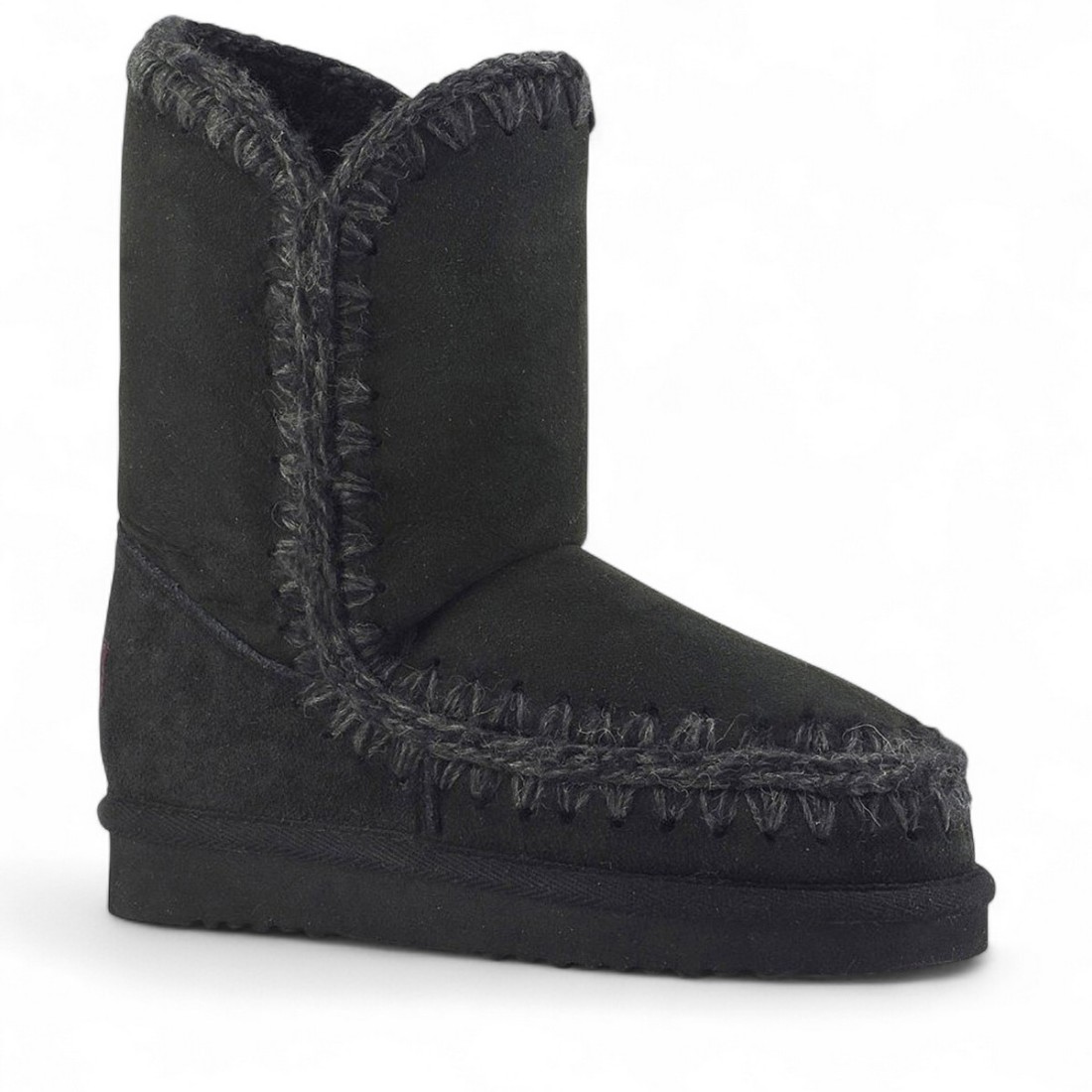 Botín MOU Eskimo 24 en ante negro, acabado con pespuntes artesanales de ganchillo y suave forro de piel de oveja de doble cara para un confort natural. El logotipo Mou en la parte trasera y la suela de goma garantizan estilo y practicidad, perfectos para quienes buscan un calzado icónico y duradero ideal para la temporada de frío.