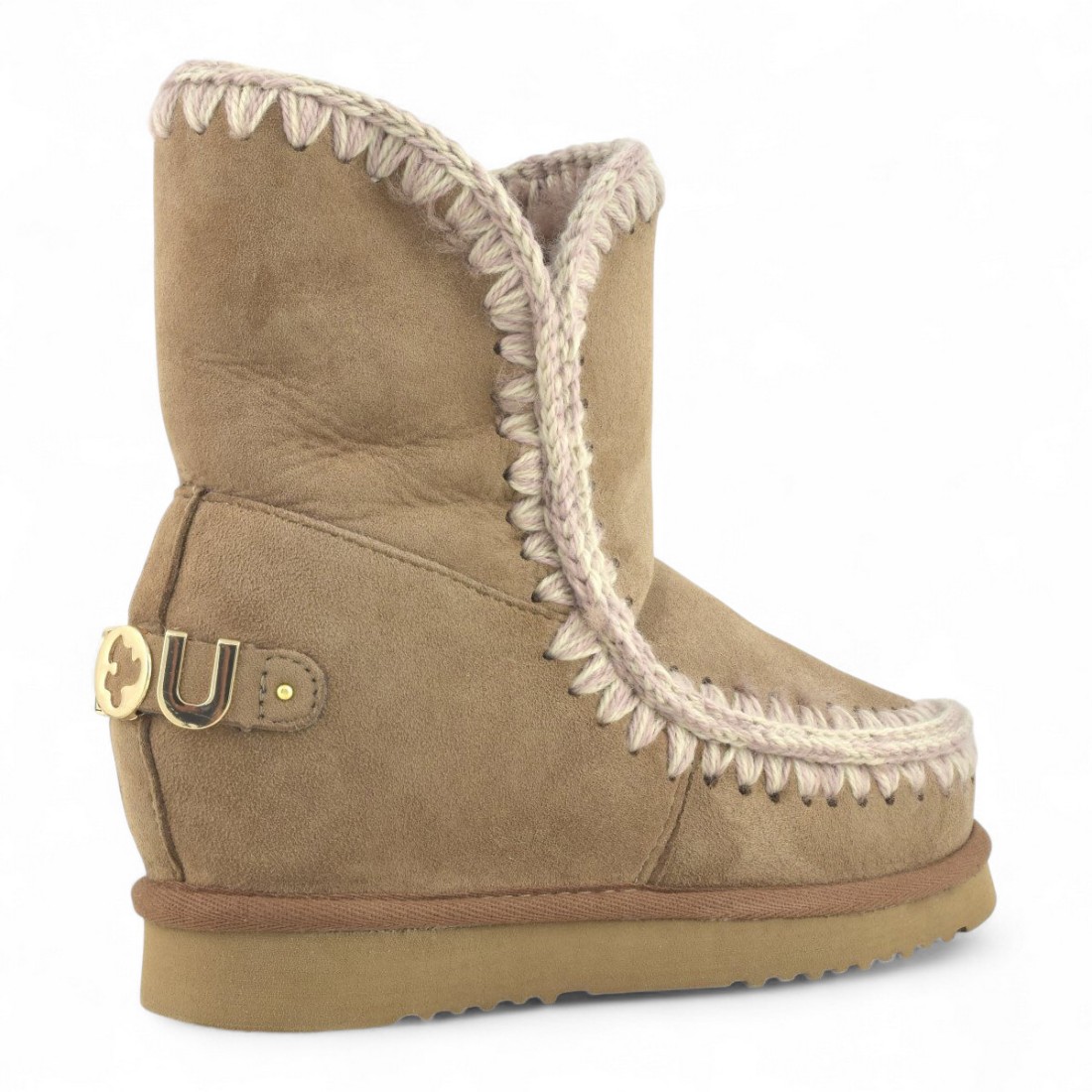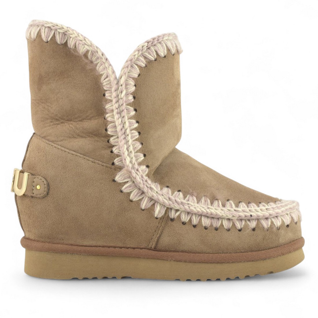 Botín MOU Eskimo Inner Wedge Short Big Metal Logo en ante beige con subtonos rosas con pespuntes de ganchillo y logotipo metálico en la parte trasera. El suave forro de piel de oveja de doble cara garantiza comodidad y calidez, mientras que la cuña interior de 50 mm y la suela de goma proporcionan sujeción y estabilidad. Perfectas para un estilo refinado y versátil en los días fríos.Nuestro servicio al cliente está disponible de lunes a sábado de 10:00 a 19:30