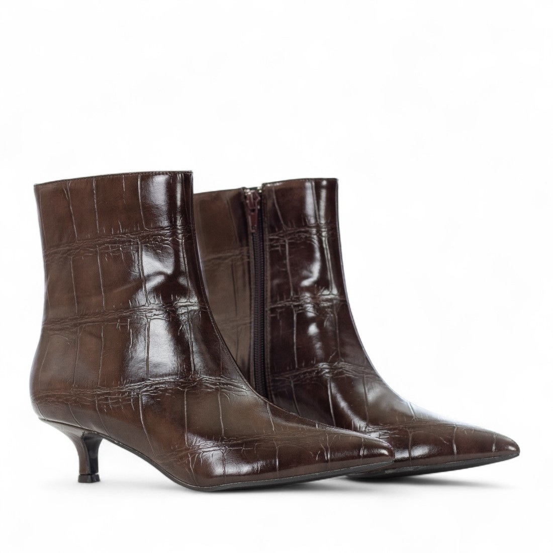 Botín Exé en ecopiel marrón efecto cocodrilo, perfecto para dar un toque original y sofisticado a tu look. El tacón de aproximadamente 50 mm garantiza comodidad y estilo. Equipado con una práctica cremallera lateral, forro de tela y piel sintética, suela de cuero y suela de goma para un ajuste estable y cómodo.Nuestro servicio al cliente está disponible de lunes a sábado de 10:00 a 19:30