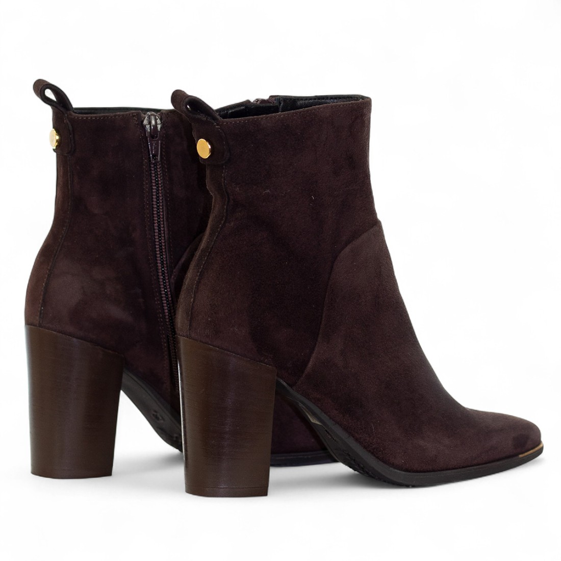 Botín Ancamy en suave terciopelo marrón, elegante y cómodo. Equipado con cremallera lateral para un ajuste práctico, tacón de 85 cm, forro y plantilla de piel. La suela de goma garantiza estabilidad y agarre. Perfectos para completar looks refinados con un toque de clase y feminidad sin renunciar a la comodidad.