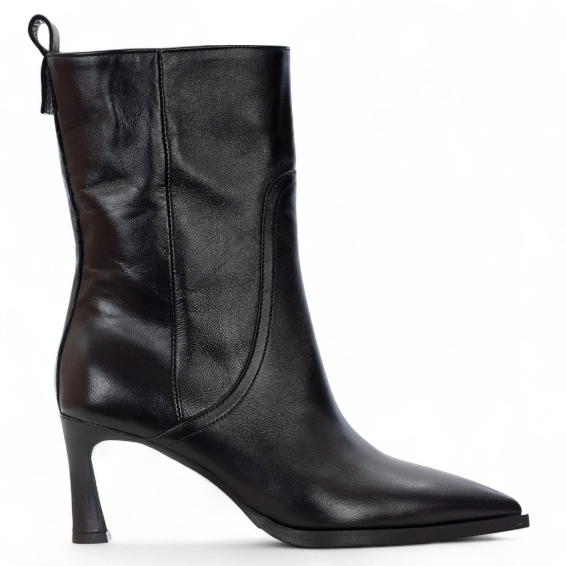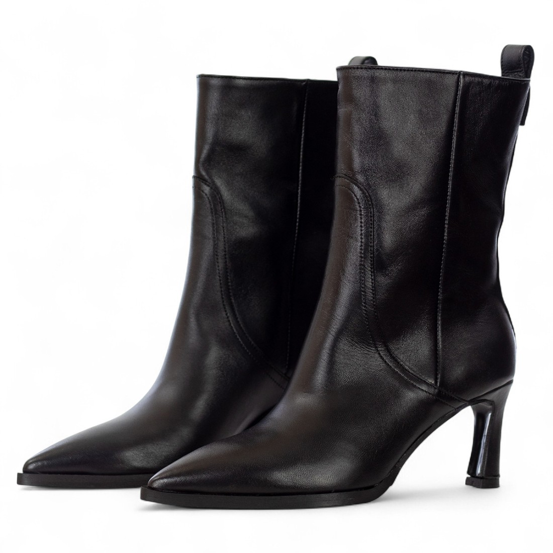 Botín Ancamy en piel negra, con un diseño elegante y moderno. Tacón de 7,5 cm, forro y plantilla de piel para el máximo confort. Suela de goma antideslizante, perfecta para combinar estilo y practicidad en cualquier ocasión.