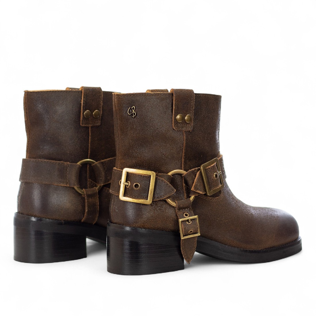 Botín Coral Blue en suave ante marrón efecto vintage, con tacón de 55 mm y correas laterales. Forro y plantilla de piel para el máximo confort y transpirabilidad. La suela de goma garantiza estabilidad, por lo que es ideal para completar un look chic y sofisticado en cualquier ocasión.