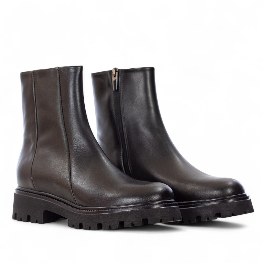 Botín de piel negra con tacón de 50 mm y cremallera lateral. El forro y la plantilla de piel ofrecen comodidad y confort, mientras que la suela de goma garantiza la estabilidad. Elegante y versátil, es ideal para completar un look chic en cualquier ocasión, combinando estilo y practicidad en un solo modelo.