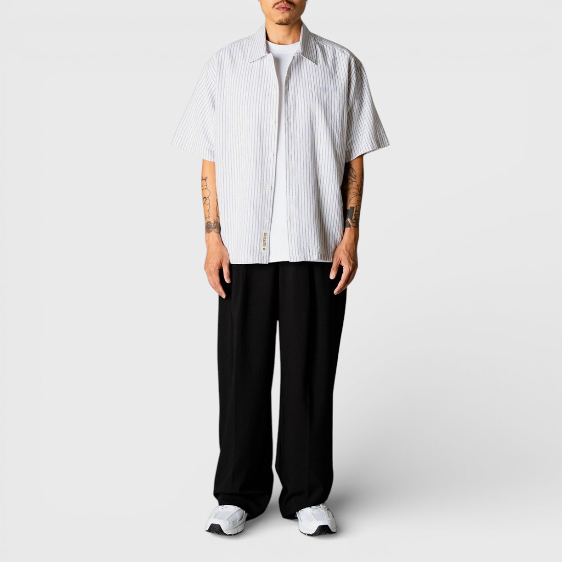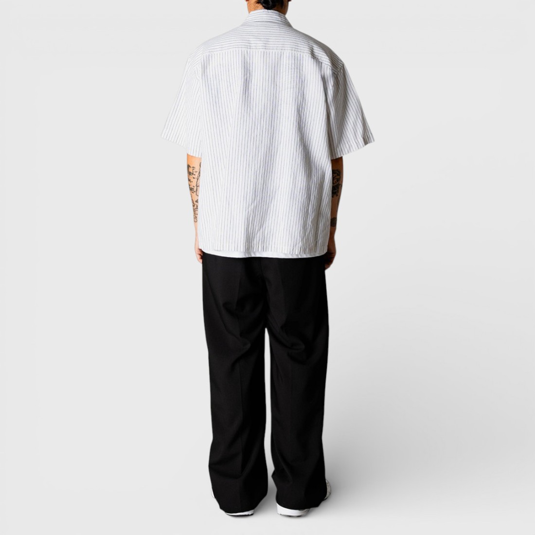 Camisa de manga corta Woodbird WBWang Tai de lino y algodón blanco (55% lino, 45% algodón) con diseño de rayas verticales. Cuello clásico y cierre con botones en toda la longitud. Corte oversize para un look cómodo y moderno, perfecto para llevar en cualquier ocasión informal.
