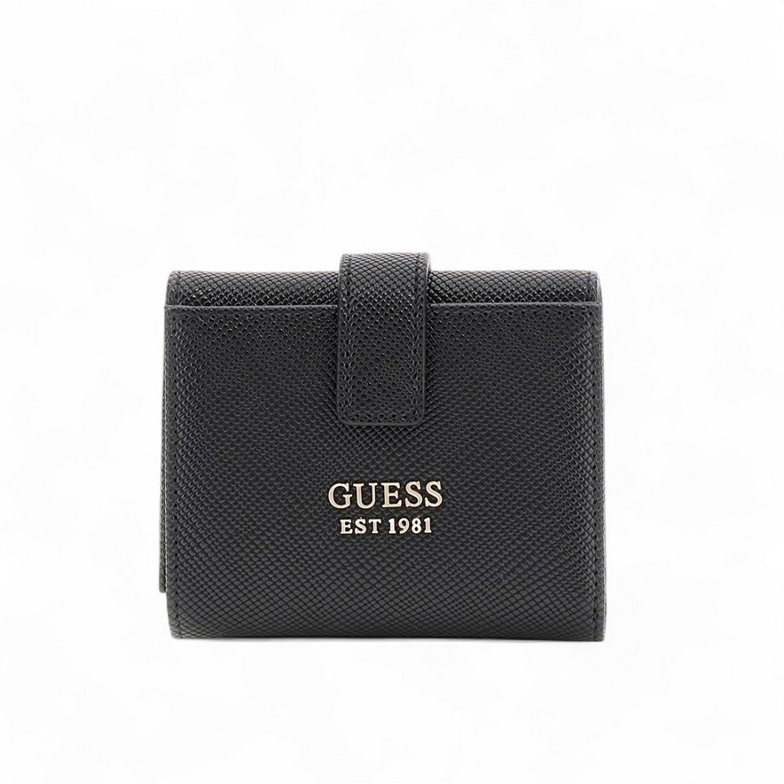 Minicartera GUESS Rosalba en piel sintética negra con elegante acabado saffiano y herrajes en oro pálido. Cierre de cremallera, compartimento principal con bolsillo interior para monedas y ranuras para tarjetas de crédito. Logotipo metálico en la parte frontal. Dimensiones compactas 11x9x2 cm, ideal para practicidad y estilo.