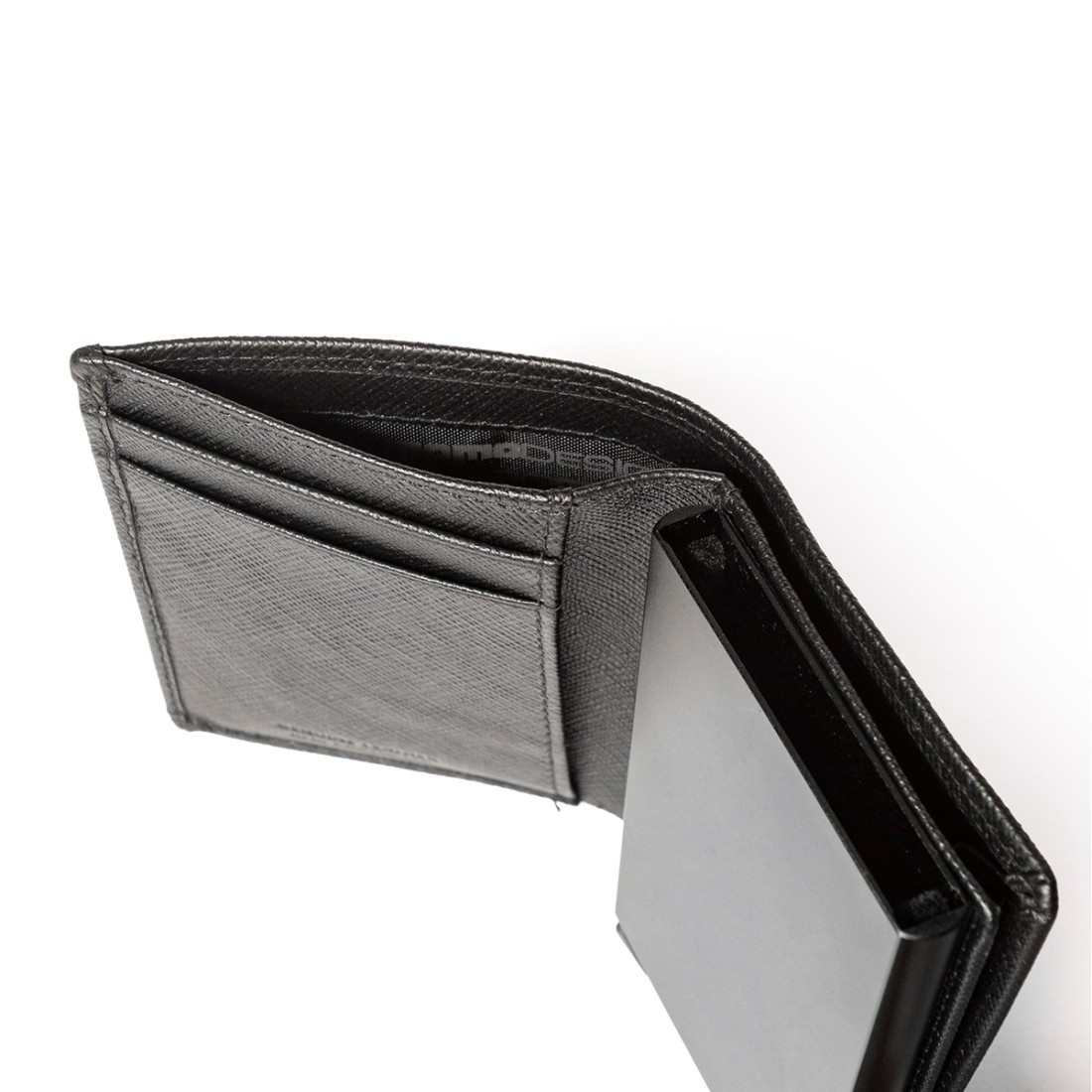 Cartera Momodesign de piel saffiano negra, elegante y compacta. Dotada de un doble compartimento interior para organizar billetes y tarjetas con practicidad. El logotipo en relieve tono sobre tono completa su refinado diseño, haciéndola perfecta para quienes buscan estilo y funcionalidad en un accesorio de uso diario.
