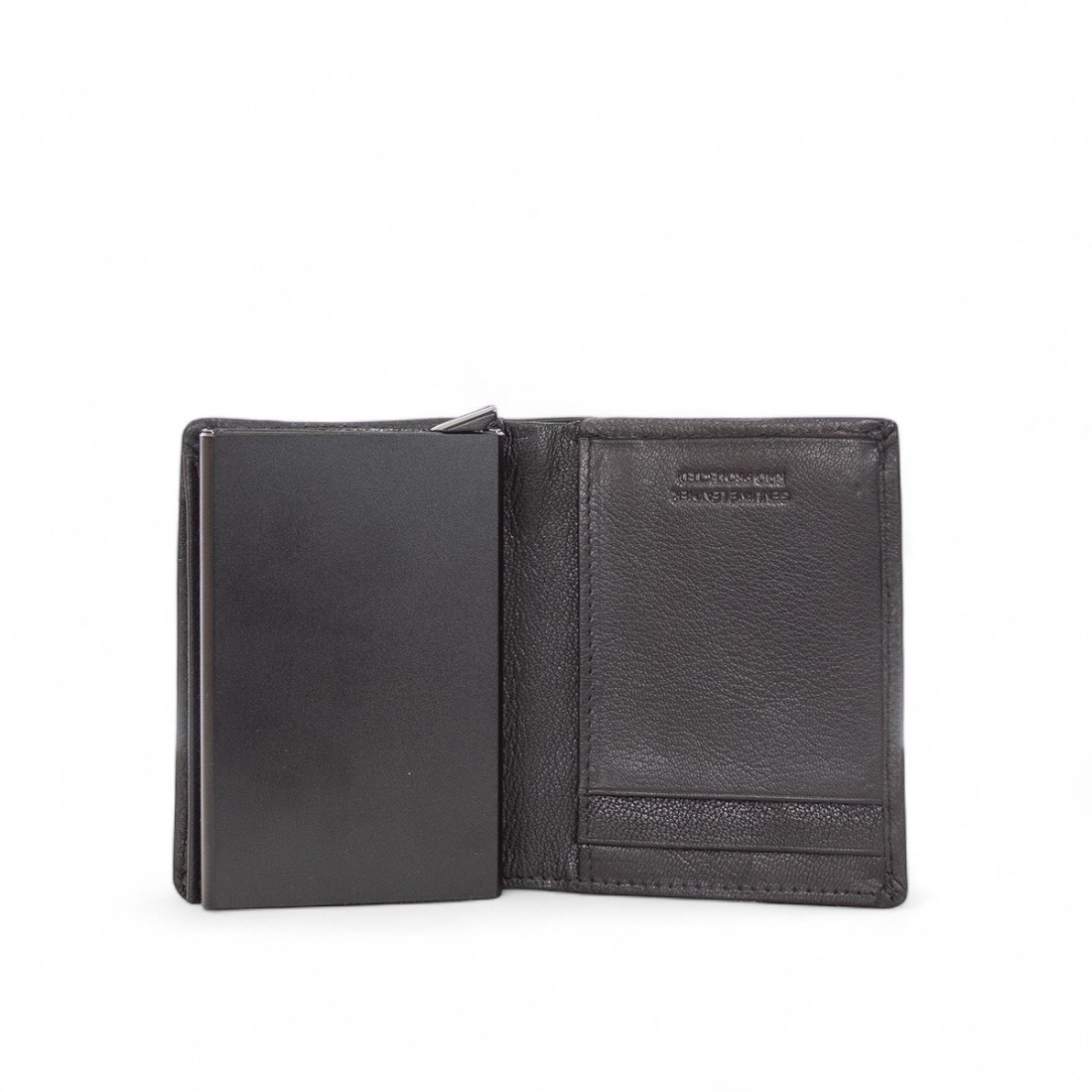 Tarjetero Momodesign de piel martillada, adornado con una placa frontal con el logotipo. Equipado con un bolsillo para billetes, dos ranuras y un tarjetero metálico interior. Compacto y práctico, ideal para el día a día. Medidas: 7 × 10 × 2 cm. Color: negro.Nuestro servicio al cliente está disponible de lunes a sábado de 10:00 a 19:30