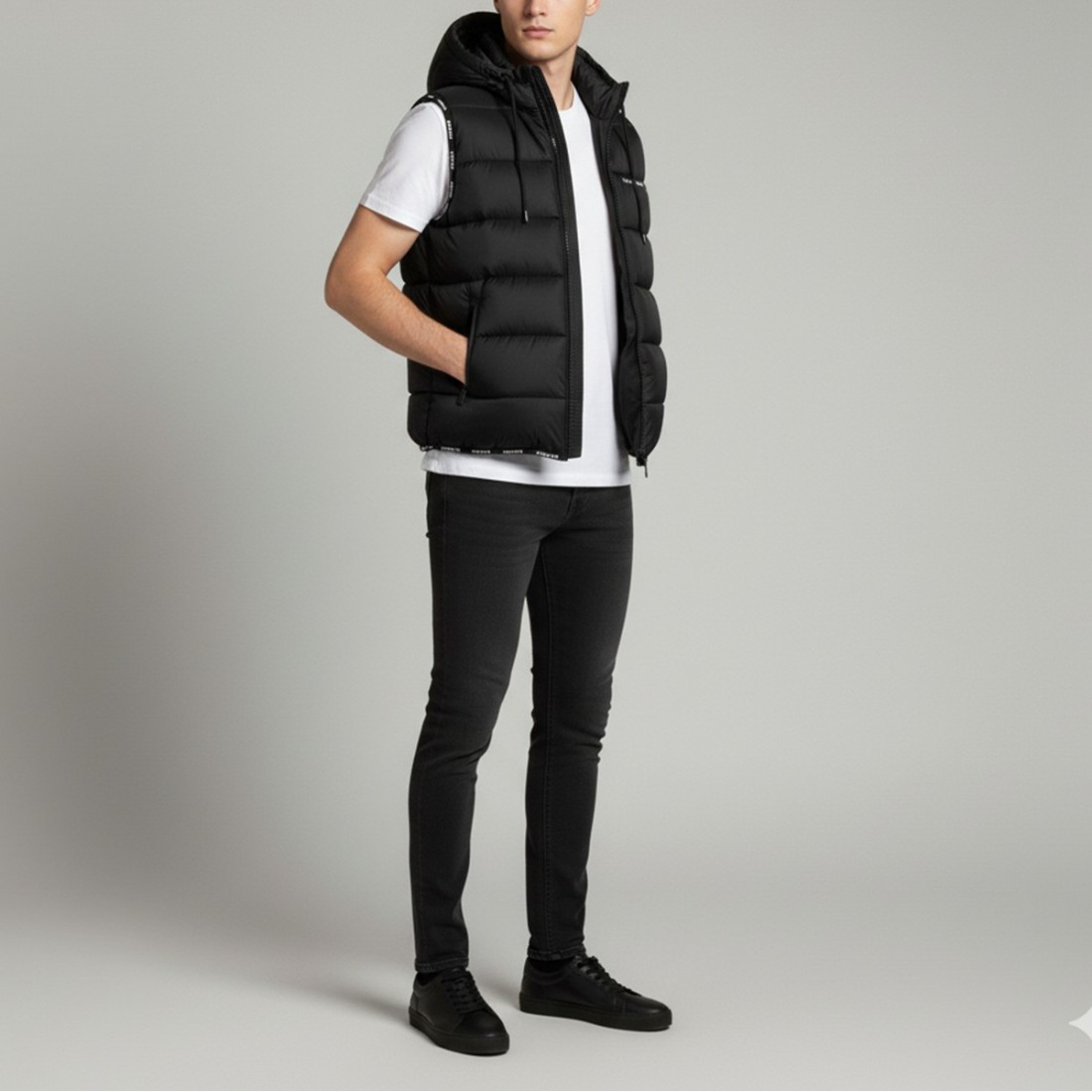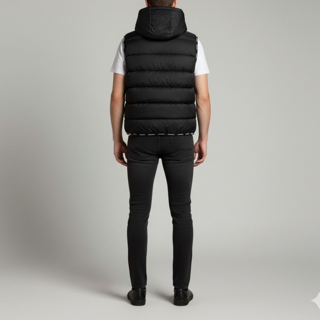 Chaqueta sin mangas Richmond X de nailon negro de diseño moderno con letras impresas en el pecho y dobladillos con logotipo. Cuenta con cierre de cremallera, bolsillos laterales con cremallera y capucha ajustable con cordón. Corte regular, perfecto para looks urbanos e informales a la última.