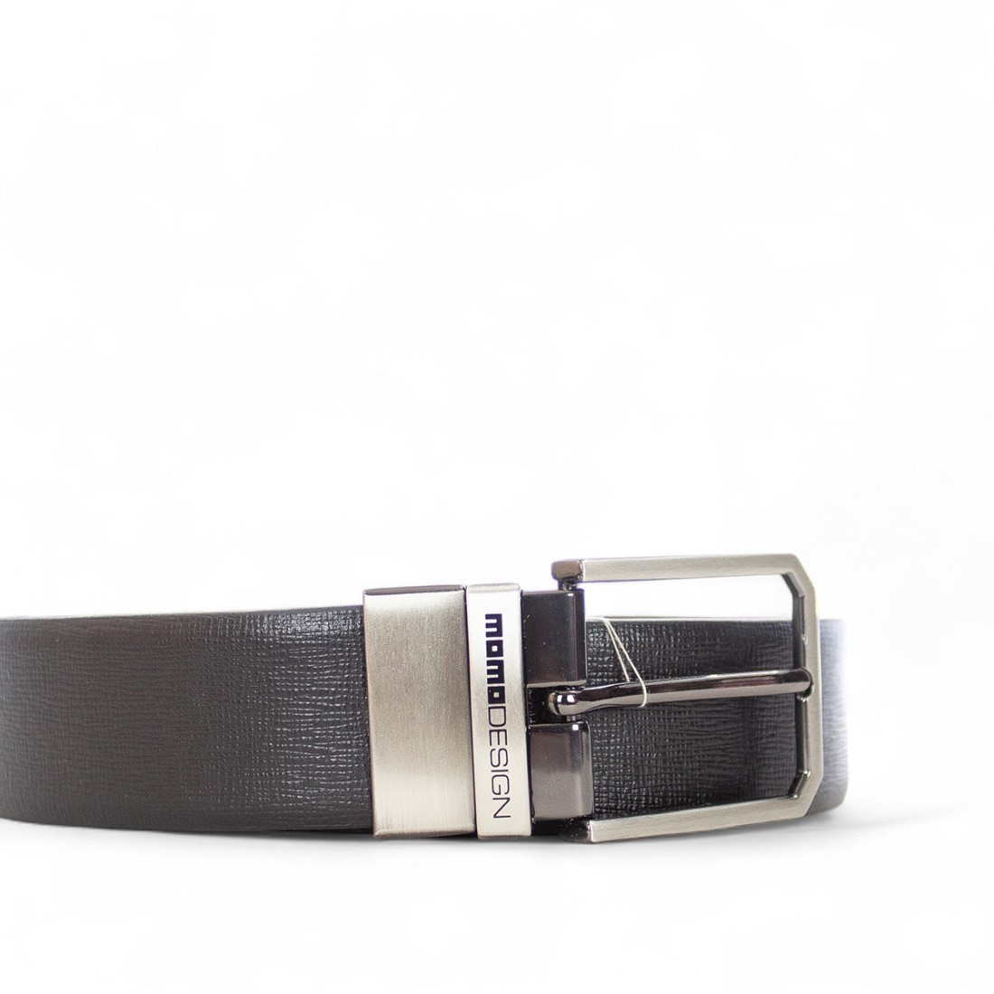 Cinturón reversible para hombre Momodesign en 100% piel, con un lado en elegante saffiano negro y el otro en suave piel azul mate. Equipado con hebilla metálica plateada y trabilla con logotipo, ofrece un estilo versátil y cuidado. Con una altura de 3,5 cm, está confeccionado en Italia con especial atención al detalle.