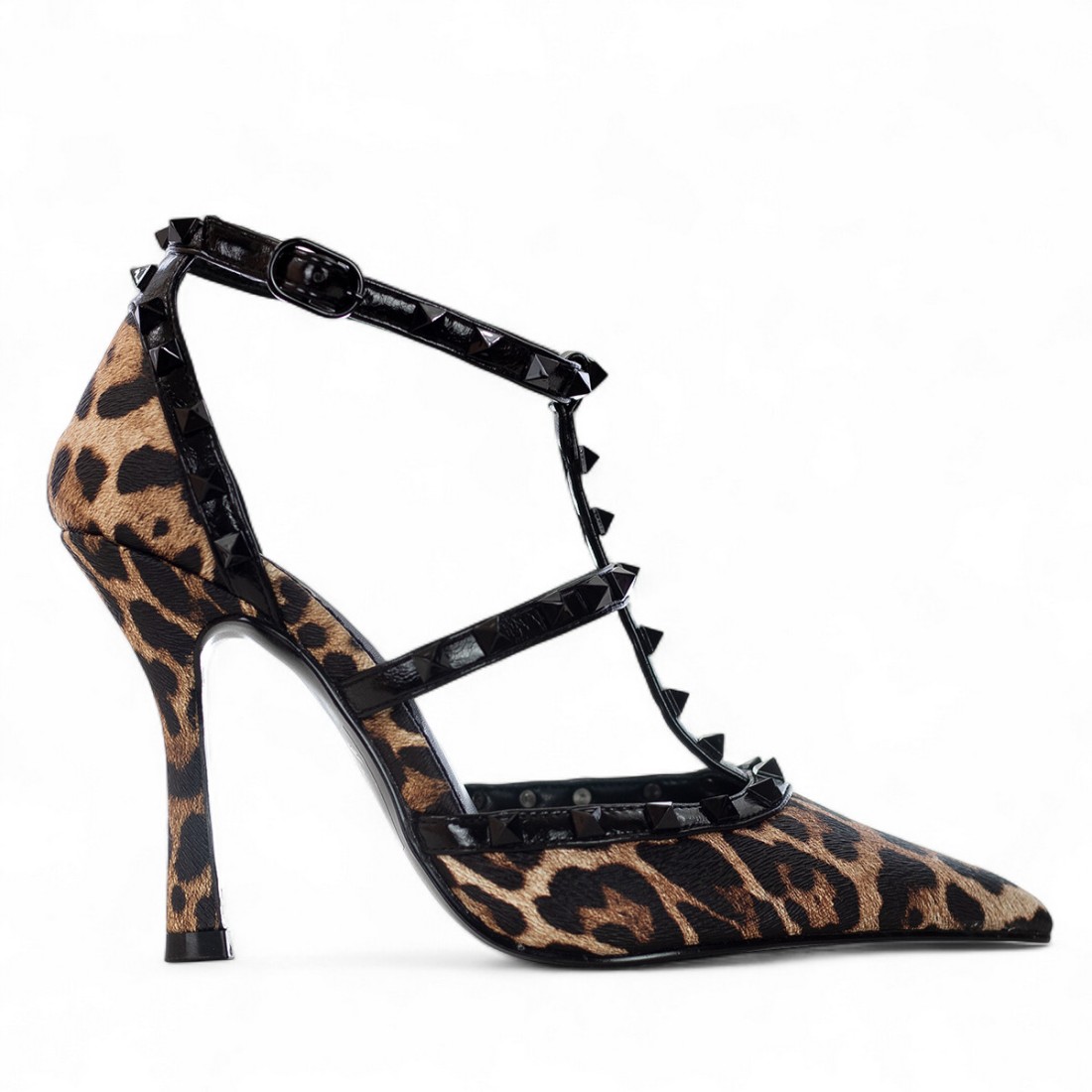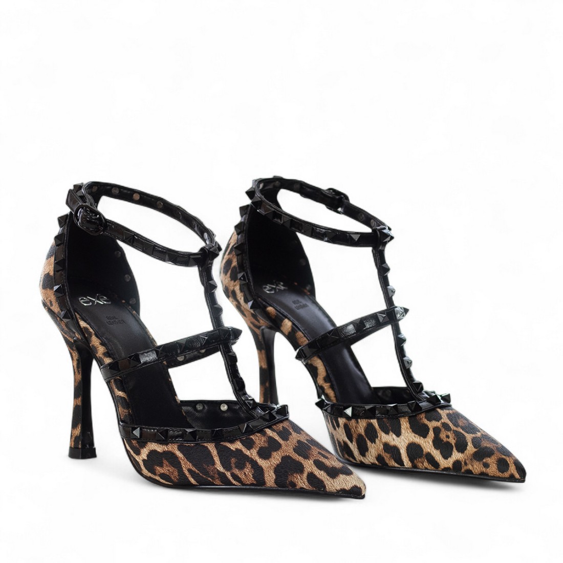 Zapatos de salón EXÉ de piel sintética con estampado de leopardo y diseño moderno, enriquecidos con una doble tira de tachuelas piramidales y un cierre de hebilla en el tobillo. El tacón de 100 mm de altura estiliza la silueta al tiempo que garantiza la estabilidad gracias a la suela de goma. Forro de piel sintética y plantilla de piel para un confort elegante y refinado, perfecto para looks chic y veladas especiales.Nuestro servicio al cliente está disponible de lunes a sábado de 10:00 a 19:30
