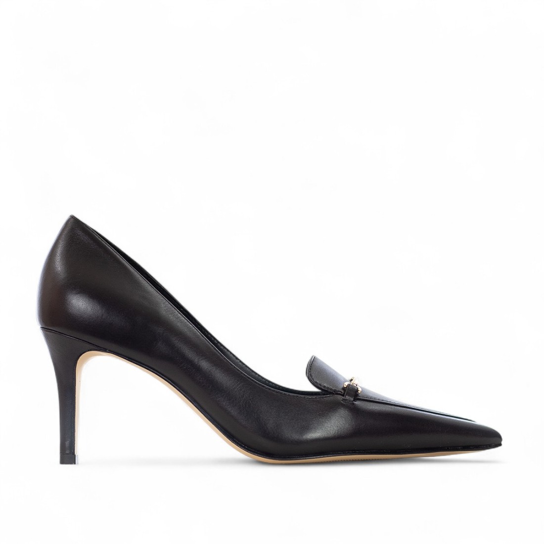 Décolleté Michael Kors en piel negra, caracterizado por una elegante pinza metálica dorada con el logotipo en el empeine. El tacón de 80 mm realza la silueta, mientras que la suela de goma garantiza la estabilidad. El forro y la plantilla de piel garantizan confort y calidad. Perfectos para completar refinados looks de día y de noche.