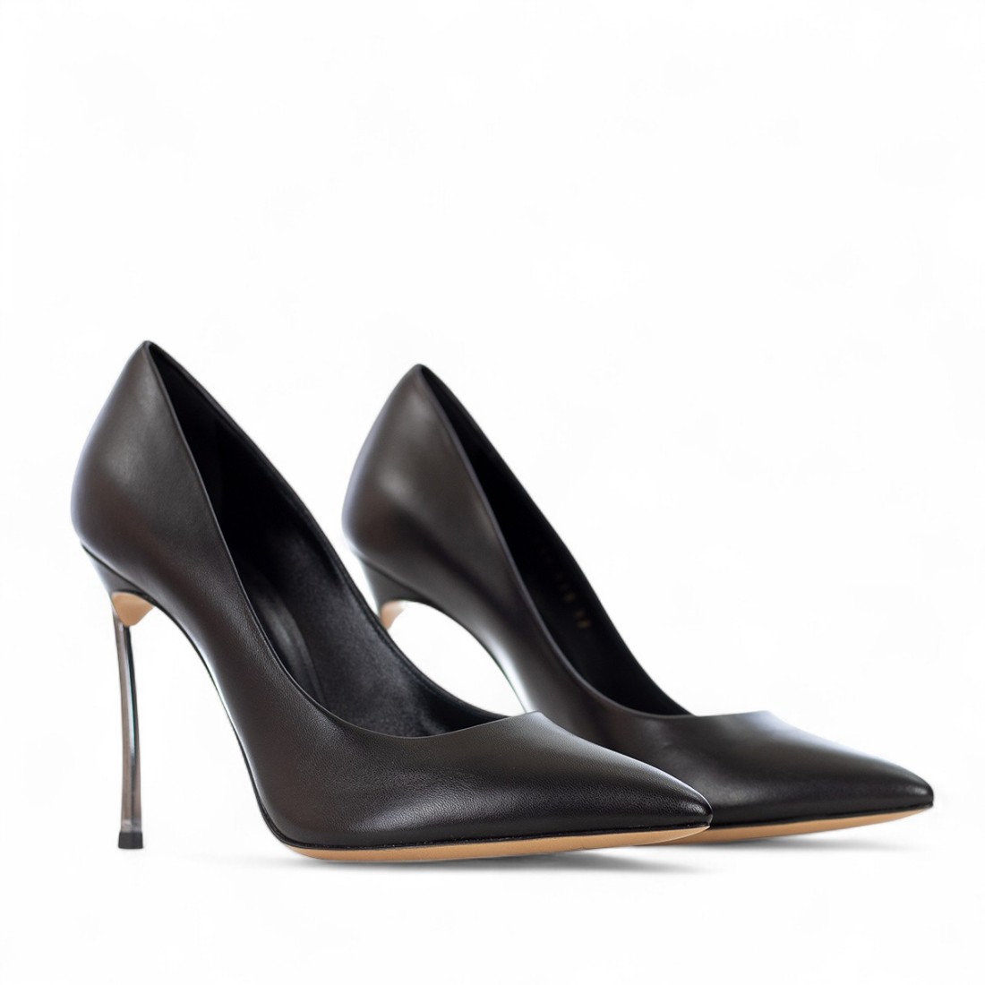 Escote Super Blade de piel barnizada con un refinado acabado metálico que aporta luz e intensidad. El tacón Blade de auténtico acero de 100 mm aporta un toque moderno y decidido, sin perder elegancia ni estabilidad. Un modelo icónico, realizado con artesanía y materiales nobles. 100% Made in Italy.