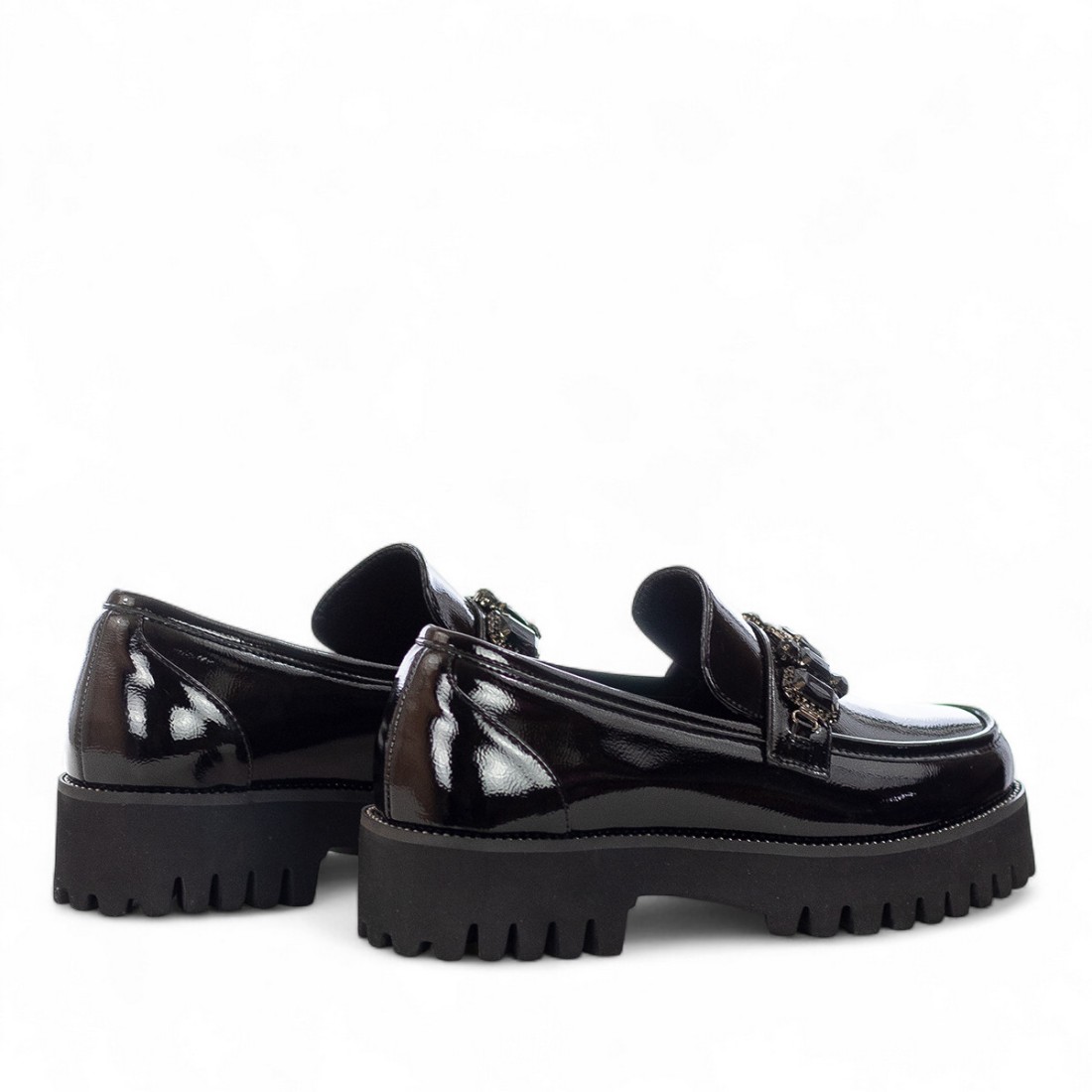 Elegante mocasín EXÉ de piel sintética negra con refinado estampado de cocodrilo y tira decorada con piedras tono sobre tono en la pala. Suela de goma de 35 mm para mayor comodidad y estabilidad, forro y plantilla de piel sintética. Perfectos para un estilo sofisticado y versátil, ideales para completar looks informales o formales con un toque de clase.Nuestro servicio al cliente está disponible de lunes a sábado de 10:00 a 19:30