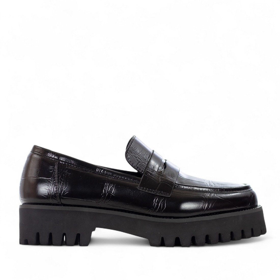 Mocasín EXÉ de piel sintética negra con elegante estampado de cocodrilo, que presenta una refinada tira ornamental en el empeine. Equipado con suela de goma de 35 mm para mayor comodidad y estabilidad, tiene forro y plantilla de piel sintética. Ideal para un estilo sofisticado y contemporáneo, perfecto para cualquier ocasión.Nuestro servicio al cliente está disponible de lunes a sábado de 10:00 a 19:30