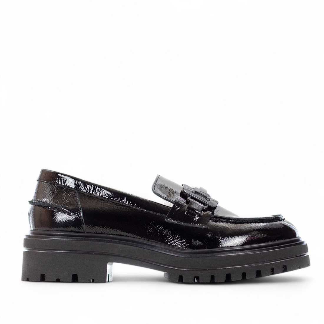 Mocasín negro de piel efecto napa con tacón de 40 mm. El forro y la plantilla de piel ofrecen comodidad y confort, mientras que la suela de goma garantiza estabilidad a cada paso. Elegante y versátil, es la elección perfecta para completar un look chic en cualquier ocasión.