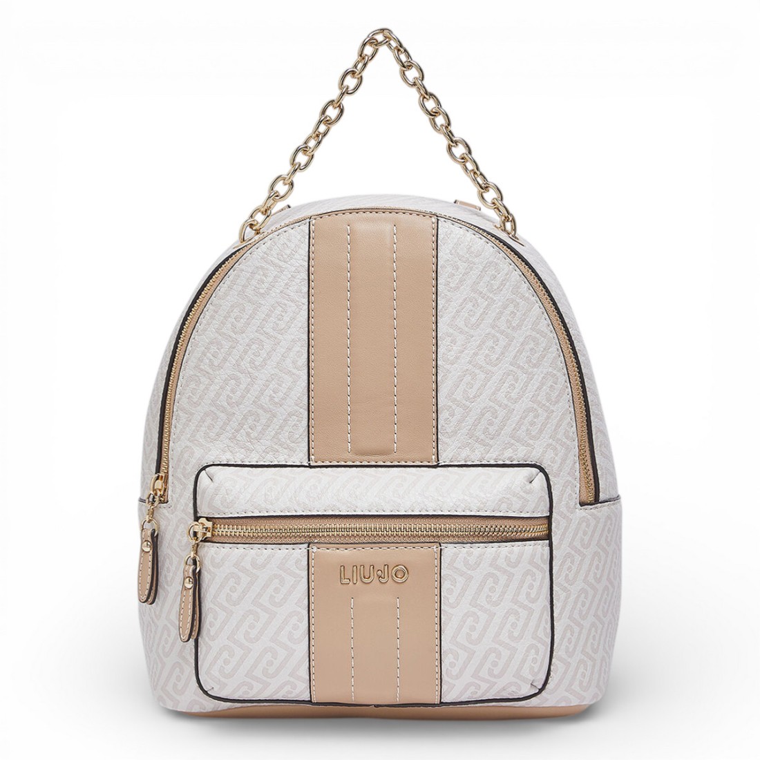 Mochila de piel sintética beige efecto envejecido, con elegante logotipo monograma estampado y banda vertical de color empolvado oscuro en la parte delantera. Compacta pero espaciosa, mide 23x28x12 cm y cuenta con un compartimento principal y un bolsillo delantero con cremallera. Las correas ajustables de piel sintética para los hombros ofrecen una comodidad personalizada, perfecta para completar cualquier look con estilo.Nuestro servicio al cliente está disponible de lunes a sábado de 10:00 a 19:30