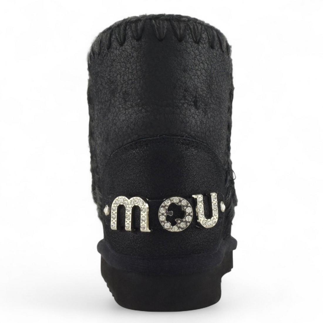 Descubre el botín MOU Eskimo 18 Rhinestones Logo en piel negra agrietada, acabado con pespuntes de ganchillo y logotipo Mou con strass en la parte trasera. El suave forro de piel de oveja de doble cara garantiza comodidad y calidez, mientras que la suela de goma ofrece estabilidad y durabilidad. Un estilo auténtico y distintivo para cada temporada.