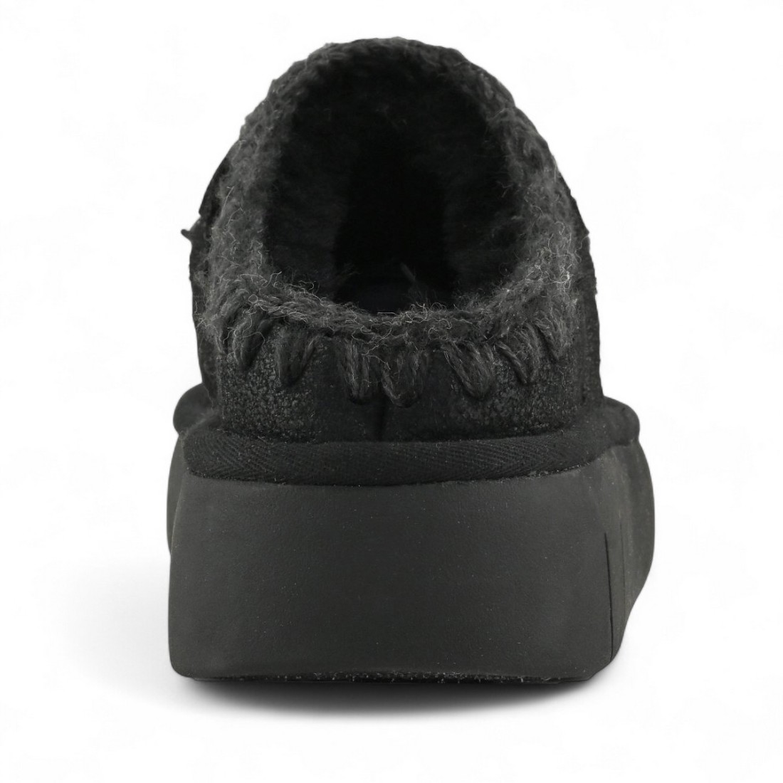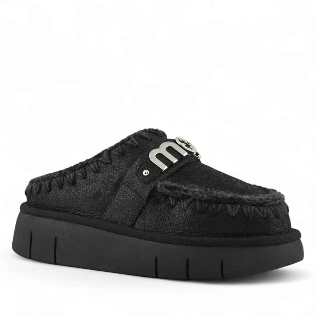 Zueco MOU Bounce sabot especial de cuero negro agrietado con pespuntes de ganchillo hechos a mano y forro de suave piel de oveja. Atención a los detalles, comodidad envolvente y suela de goma resistente, complementada con el logotipo metálico en el empeine. Perfectas para un estilo refinado y natural en las estaciones frías.