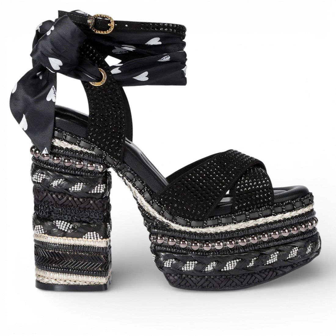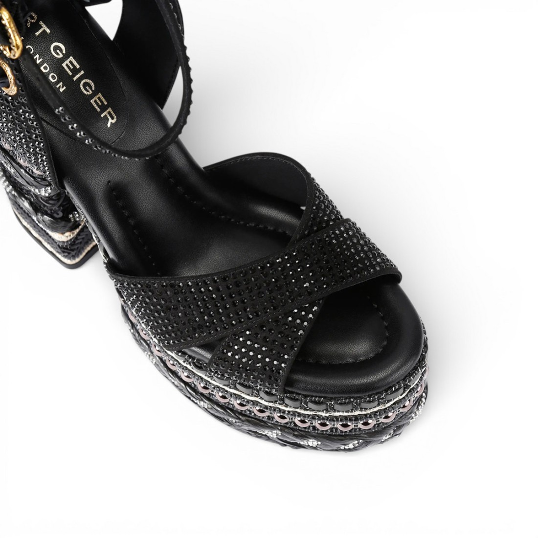 Sandalia con plataforma Chelsea Scarf de fuerte carácter. Las tiras cruzadas de tejido de pata de gallo negro están adornadas con cristales a juego que captan la luz. La tira del tobillo puede completarse con un elegante pañuelo de satén extraíble. Tacón de 13 cm, plataforma de 5 cm y suela de goma.Nuestro servicio al cliente está disponible de lunes a sábado de 10:00 a 19:30