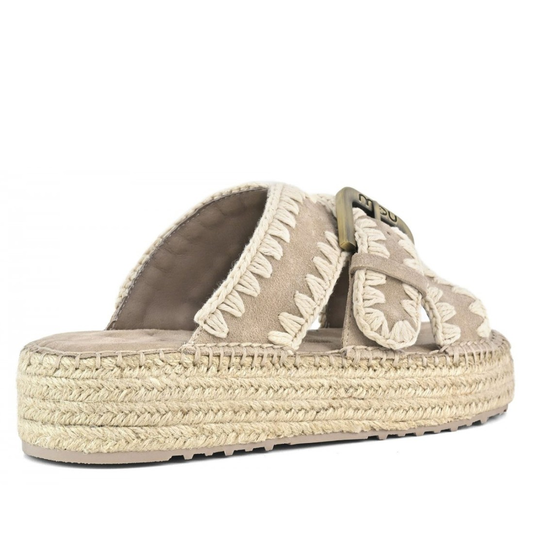 Descubre la sandalia MOU de ante beige, un accesorio elegante y versátil para cualquier ocasión. El diseño se enriquece con pespuntes de ganchillo en contraste y una maxi hebilla metálica con logotipo grabado, que añaden un toque de estilo único. La suela de goma recubierta de cuerda garantiza comodidad y durabilidad, por lo que es ideal para afrontar la temporada con estilo. Perfectos para quien busca sofisticación y practicidad en un único producto.Nuestro servicio al cliente está disponible de lunes a sábado de 10:00 a 19:30