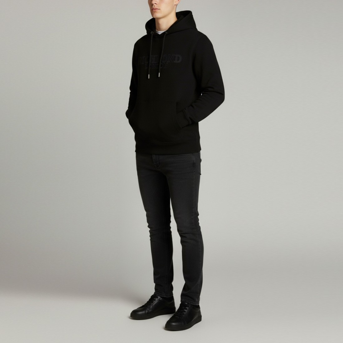 Sudadera Richmond X de algodón negro con logotipo de imitación de cuero cosido en la parte delantera. Tiene capucha ajustable con cordón, bolsillo y dobladillos elásticos. El interior de gasa garantiza comodidad y calidez. Corte regular, ideal para un look informal pero arreglado.