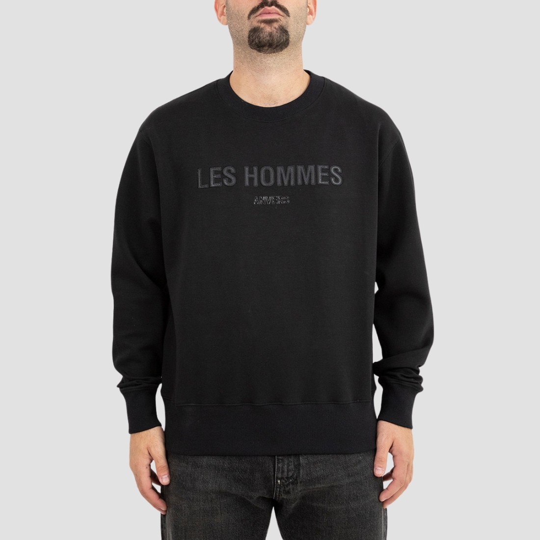 LES HOMMES - Sudadera negra de algodón, poliéster y elastano con logotipo de letras en imitación piel con bordes bordados. Cuello redondo y dobladillo de canalé. Corte regular y largo tradicional.