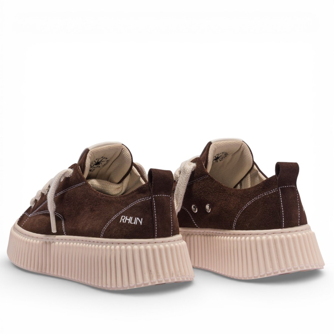 Zapatillas bajas de ante marrón con pespuntes blancos en contraste y suela de goma beige. Finos detalles como el logotipo en relieve en la lengüeta y el talón, cordones planos de algodón y sello dorado. Fabricadas con materiales 100% italianos, suela con un 20% de caucho reciclado y ensamblaje cosido y pegado para mayor resistencia. Bolsa guardapolvo de poliéster reciclado con logotipo incluida.