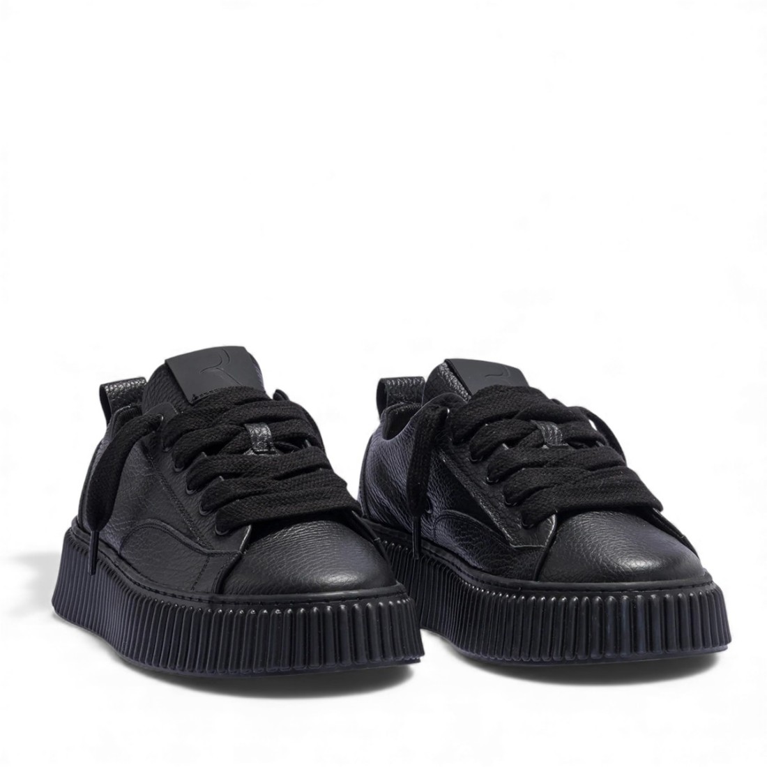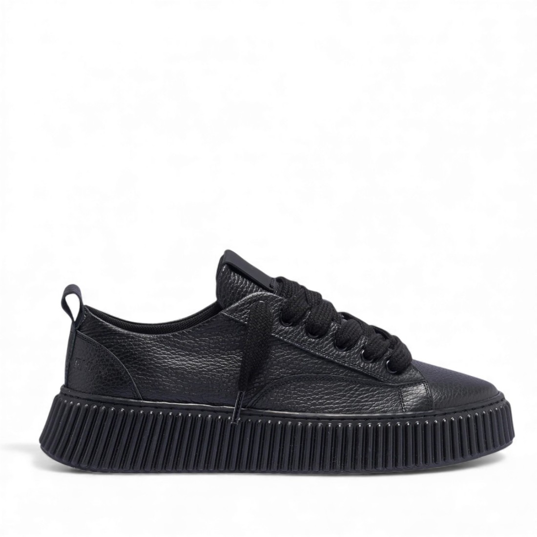 Zapatillas bajas de piel martillada negra con pespuntes a tono, lengüeta y talón con logotipo en relieve. Cordones de algodón y suela voluminosa de goma negra con un 20% de material reciclado, de 3 cm de altura y acabada con pespuntes para mayor resistencia.Nuestro servicio al cliente está disponible de lunes a sábado de 10:00 a 19:30