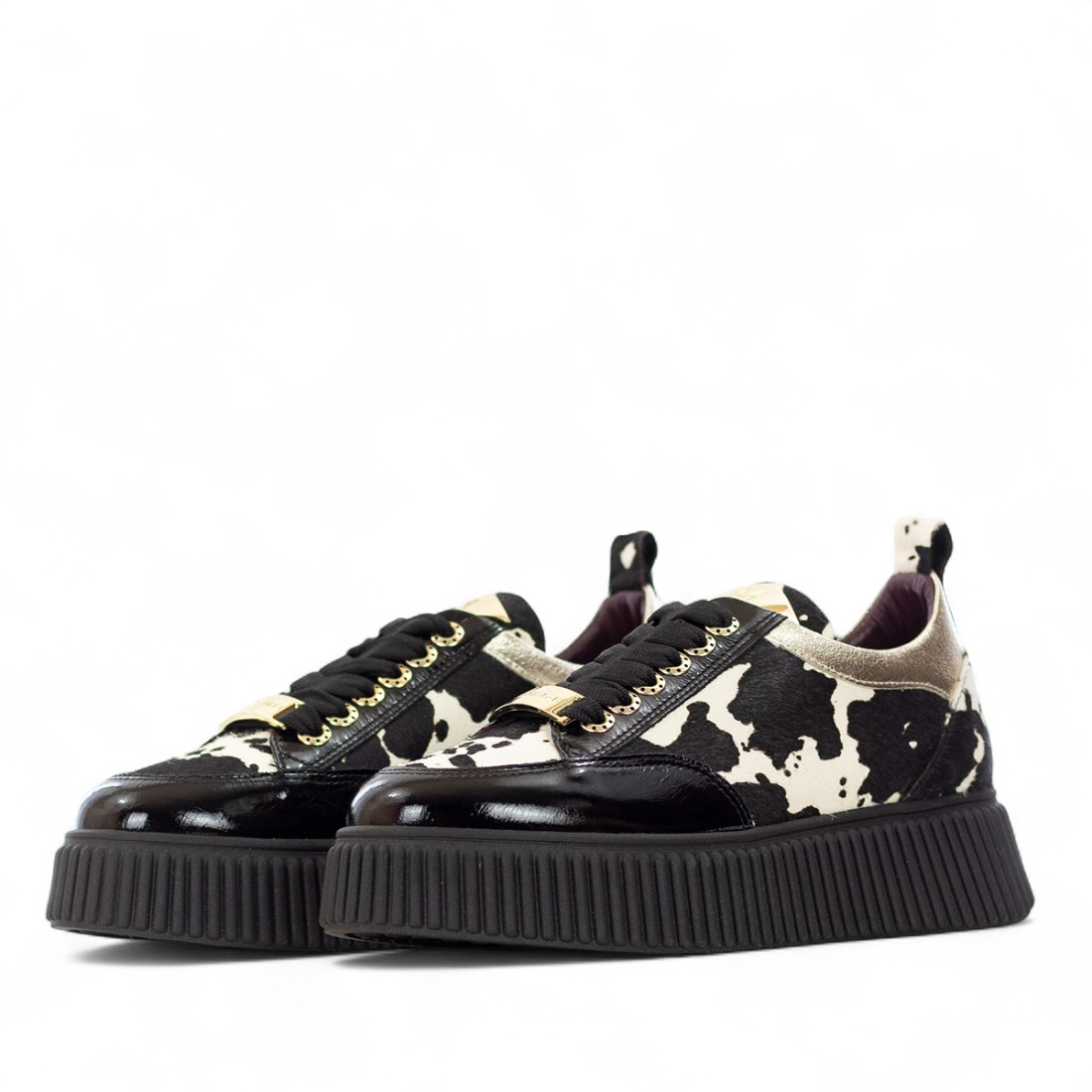 Zapatillas Lorenzo Mari de pelo de poni blanco y negro con detalles de piel laminada en la parte trasera y charol en la delantera. Logotipo en relieve en la lengüeta y el talón. Forro de piel y tejido, suela de cuero con fondo de goma. Altura del tacón aproximada de 45 mm. Un modelo con un diseño distintivo y contemporáneo, perfecto para añadir un toque original y a la moda a cualquier look.Nuestro servicio al cliente está disponible de lunes a sábado de 10:00 a 19:30