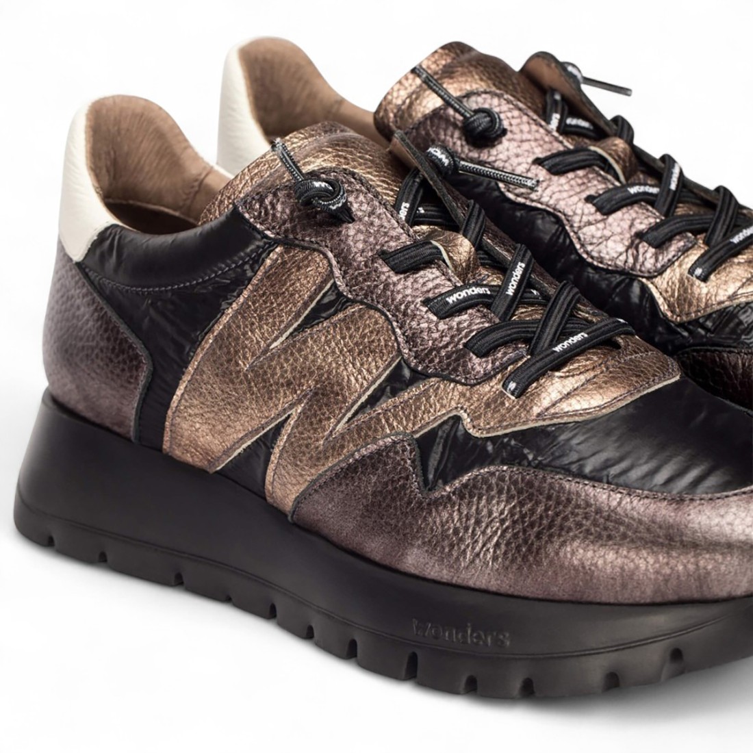 Zapatillas Wonders en suave piel martillada y laminada color bronce, con detalles en nylon negro. Un modelo versátil, perfecto para añadir un toque refinado a los looks más elegantes. La caña de aproximadamente 35 mm de altura aporta impulso y estabilidad. Forro y plantilla de piel, suela de goma duradera para un ajuste cómodo y seguro.