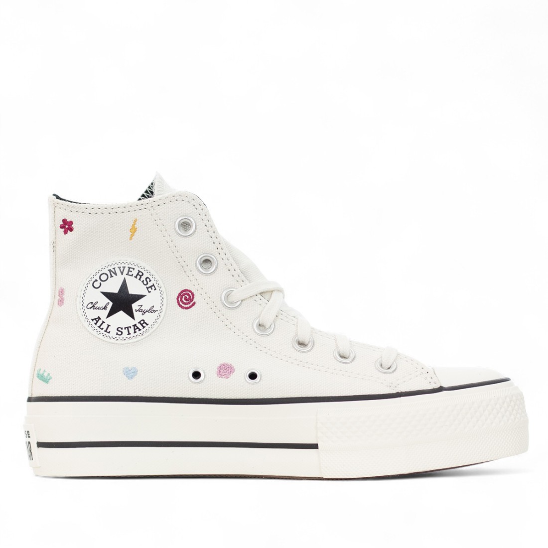 Zapatillas Converse en tejido beige con forro y plantilla de tejido. La suela de goma de 55 mm de altura garantiza estabilidad y comodidad durante todo el día. Detalles con motivos bordados multicolores en el empeine. Un zapato versátil con un diseño atemporal, perfecto para acompañar cada look con estilo, tanto en los días de trabajo como en los momentos de ocio.
