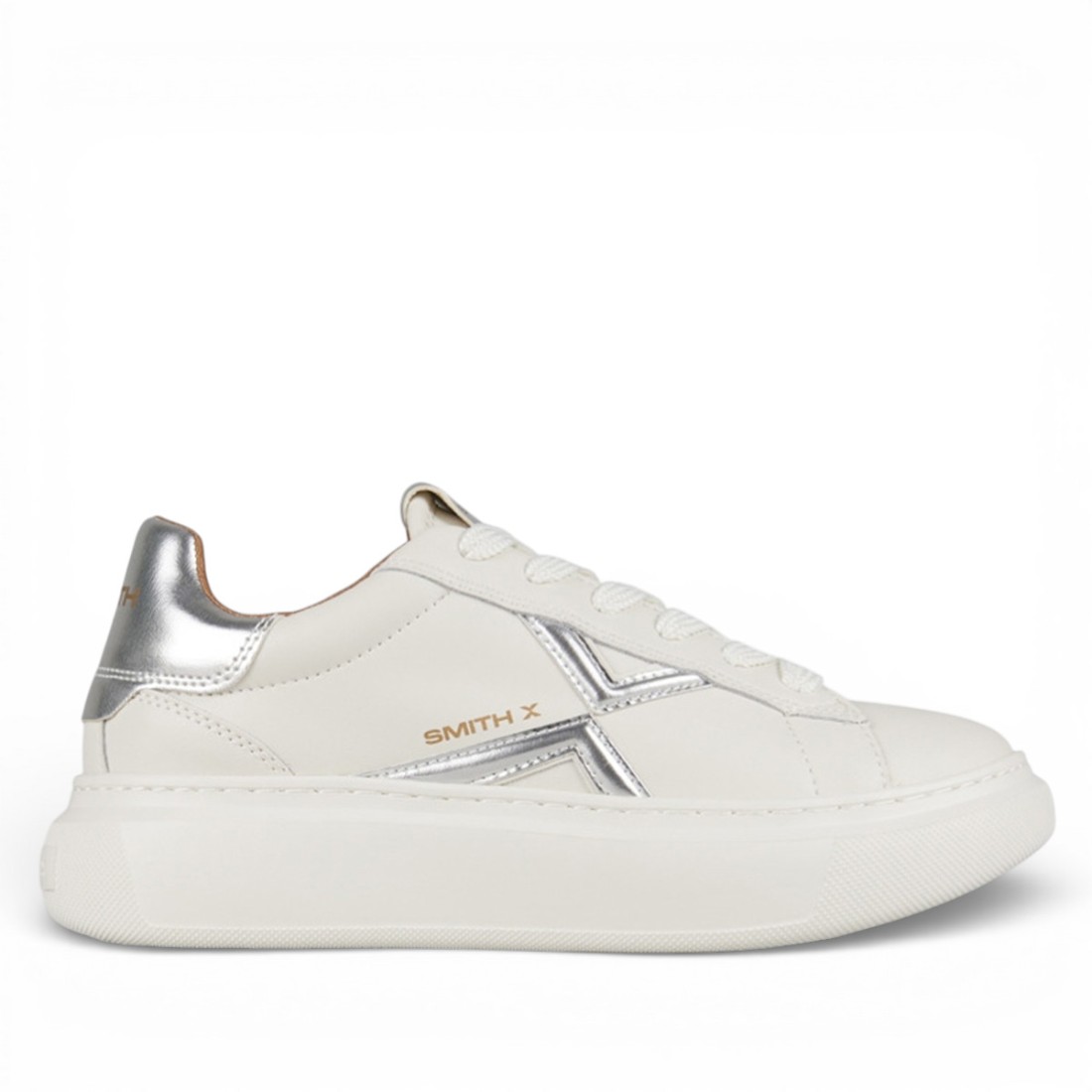 SMITH X combina carácter deportivo y estilo contemporáneo. La silueta inspirada en las deportivas varsity se realza con volúmenes equilibrados, contrastes de color y la icónica "X" lateral. El empeine de piel blanca con inserciones de laminado plateado aporta luminosidad al diseño, mientras que la robusta suela de 45 mm garantiza presencia y comodidad. Logotipo en el lateral y en la parte trasera, con plantilla extraíble de 10 mm para un ajuste práctico y cómodo.Nuestro servicio al cliente está disponible de lunes a sábado de 10:00 a 19:30