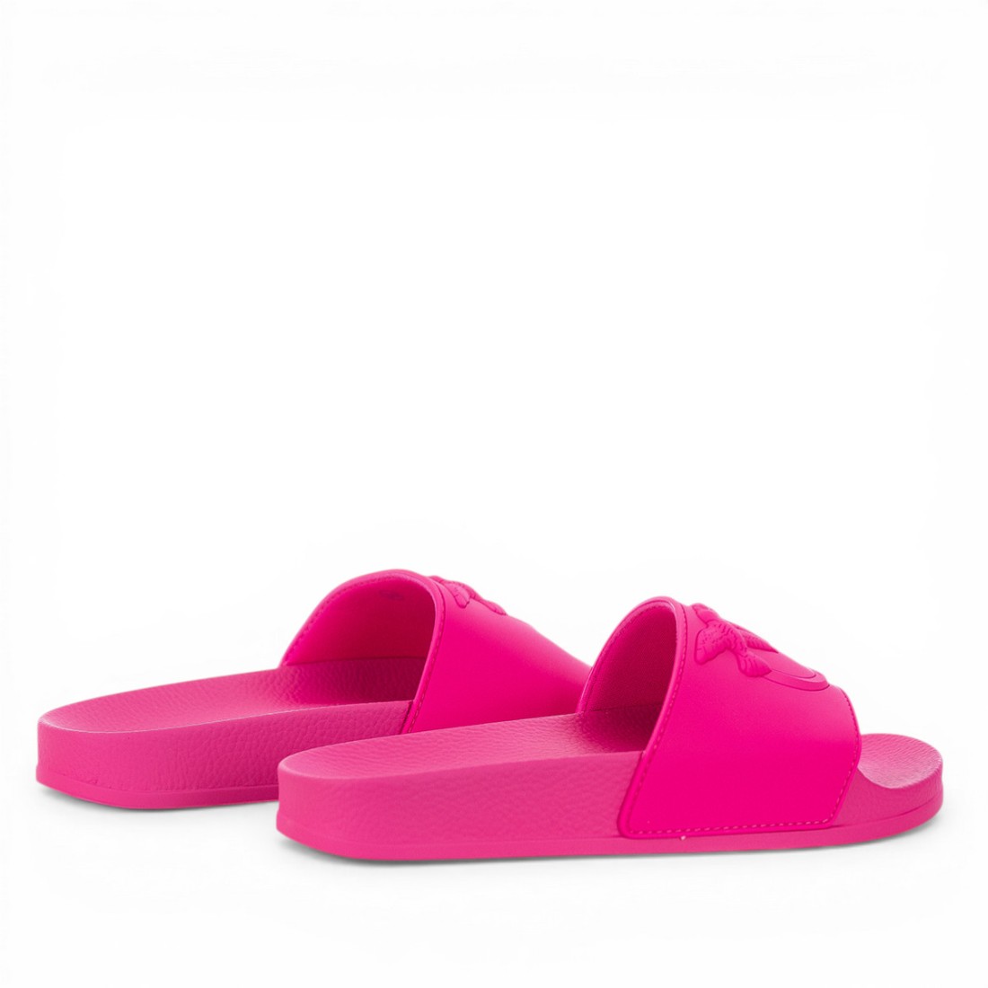 Zapatilla Pinko de goma rosa neón, práctica y con un estilo distintivo. La parte superior está adornada con el icónico logotipo Love Birds en relieve, para darle un toque reconocible. Ligera y cómoda, es perfecta para el ocio y los días de verano. Suela de goma duradera para un ajuste estable.