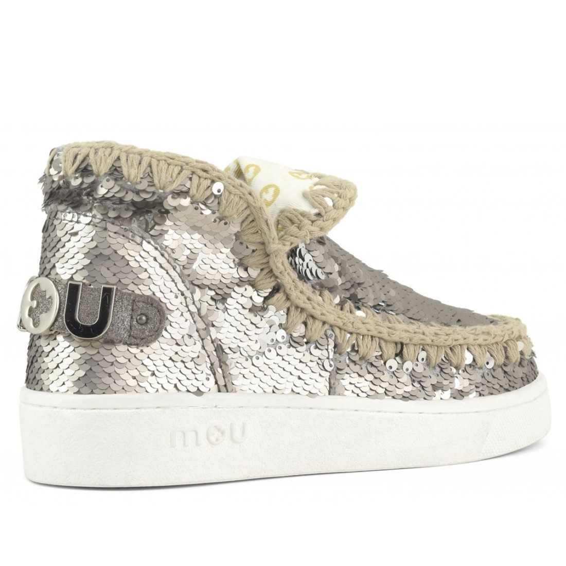 Verano Eskimo Sneaker All Sequins, confeccionada con lentejuelas gunmetal para un look brillante y original. El icónico pespunte de ganchillo añade un toque artesanal, mientras que el forro de lona de algodón garantiza comodidad y transpirabilidad. Logotipo metálico Mou en la parte trasera y suela de goma resistente, perfecta para acompañarte con estilo en los días calurosos.Nuestro servicio al cliente está disponible de lunes a sábado de 10:00 a 19:30