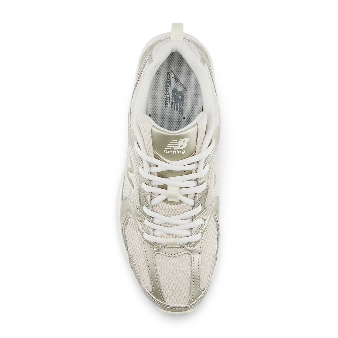 Descubre las zapatillas 530 de New Balance en malla beige con inserciones de piel laminada en color dorado. Diseño icónico con logotipo en el lateral, la lengüeta y la parte trasera. Comodidad y amortiguación superiores gracias a las tecnologías 'N-ergy' y 'ABZORB SBS'. Suela de goma duradera para una sujeción máxima. Perfectas para un estilo deportivo y dinámico.