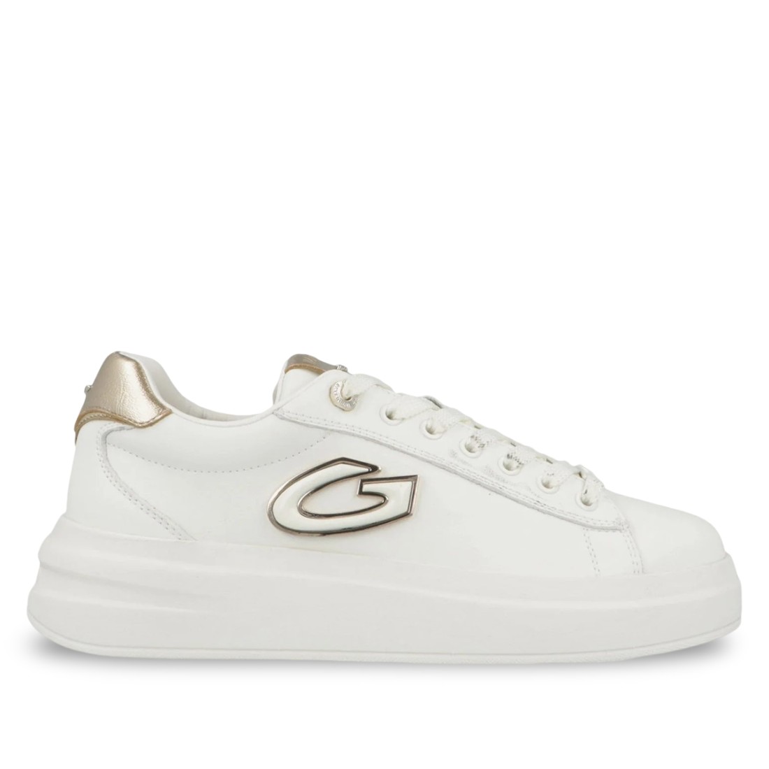 Zapatillas GUARDIANI Aeris de piel color hueso son elegantes y versátiles. El diseño se enriquece con una inserción de piel laminada dorada en la parte trasera y el logotipo del monograma grabado en relieve en el lateral para darle un toque distintivo. La suela de goma garantiza comodidad y estabilidad durante todo el día. Ideales para completar looks informales y sofisticados.