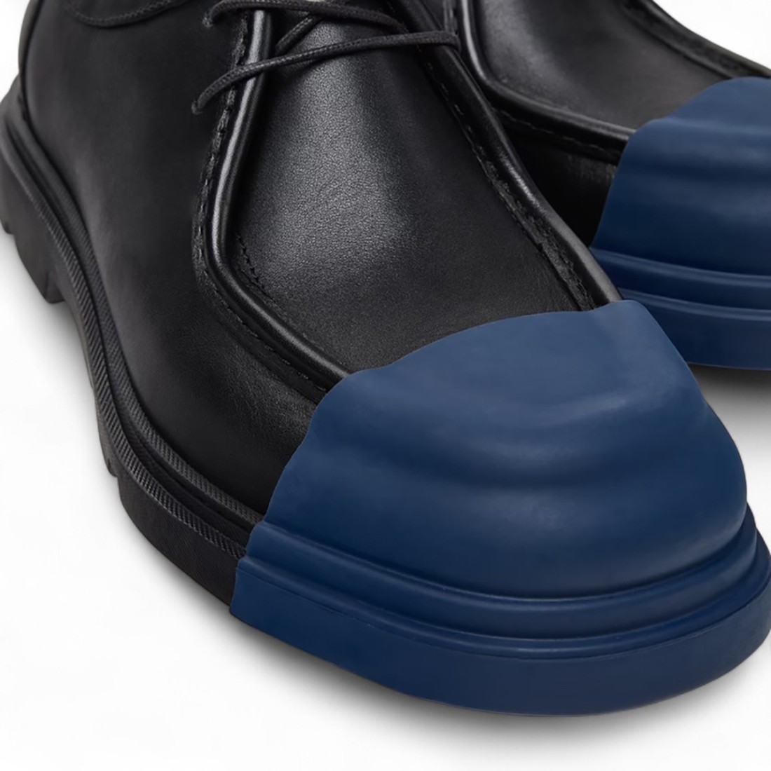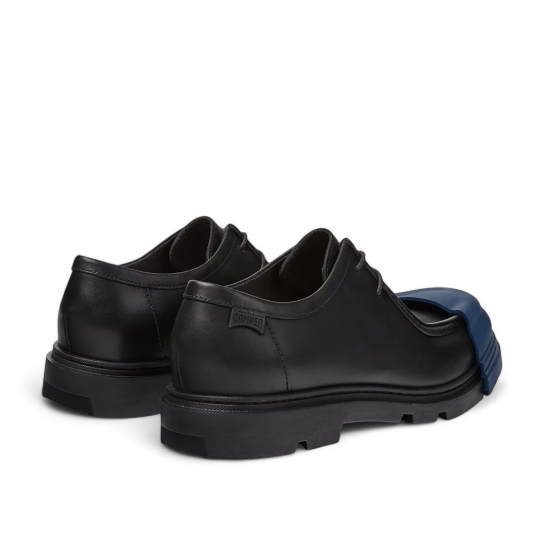 Zapatos de hombre Junction en suave piel de becerro negra, con plantillas OrthoLite® Recycled™ y suela de goma con puntera fabricada con un 23% de materiales reciclados. El diseño minimalista, fabricado con pocos componentes y poco pegamento, hace que los Junction sean fáciles de desmontar, fomentando una producción más sostenible y circular sin renunciar a la comodidad y el estilo.