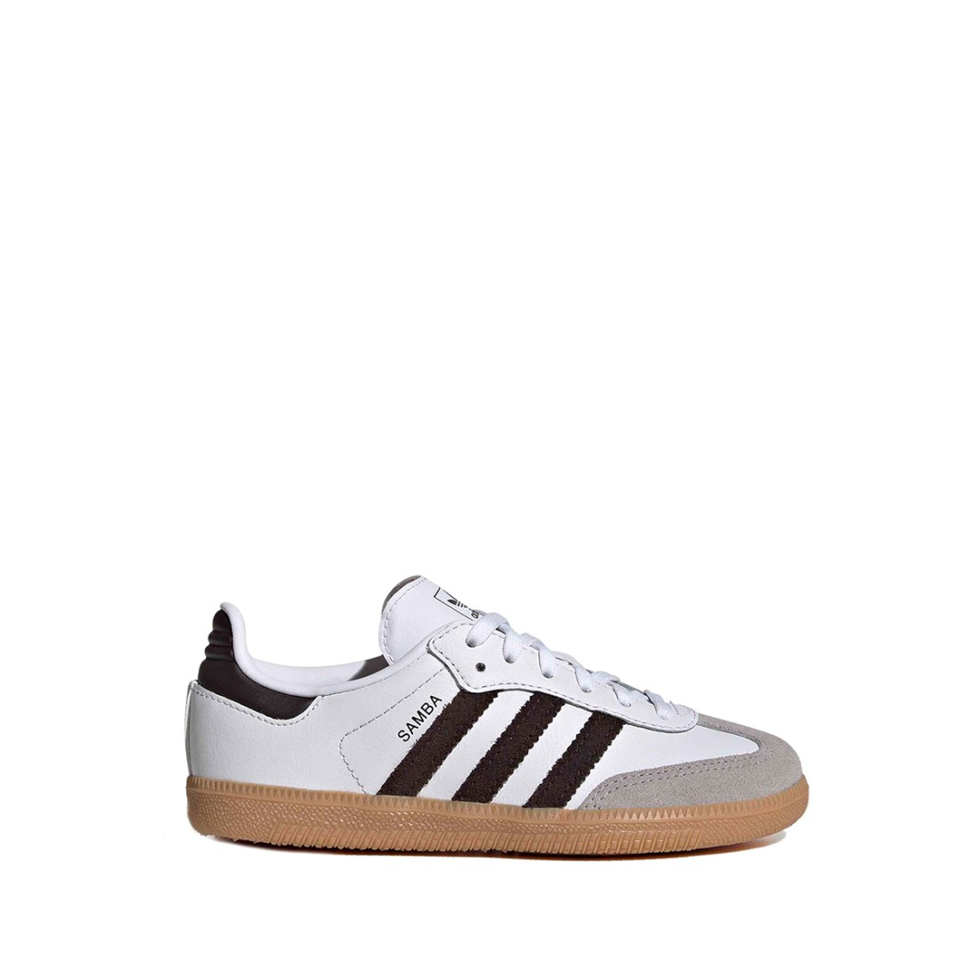 Zapatillas Adidas Samba OG para niños con parte superior de piel blanca y puntera de ante gris claro. Las tres bandas laterales y el talón en negro aportan un contraste atrevido e icónico. Suela de caucho natural para mayor agarre y comodidad en el día a día. Un modelo atemporal que combina estilo deportivo y encanto retro, perfecto para cualquier look casual.Nuestro servicio al cliente está disponible de lunes a sábado de 10:00 a 19:30