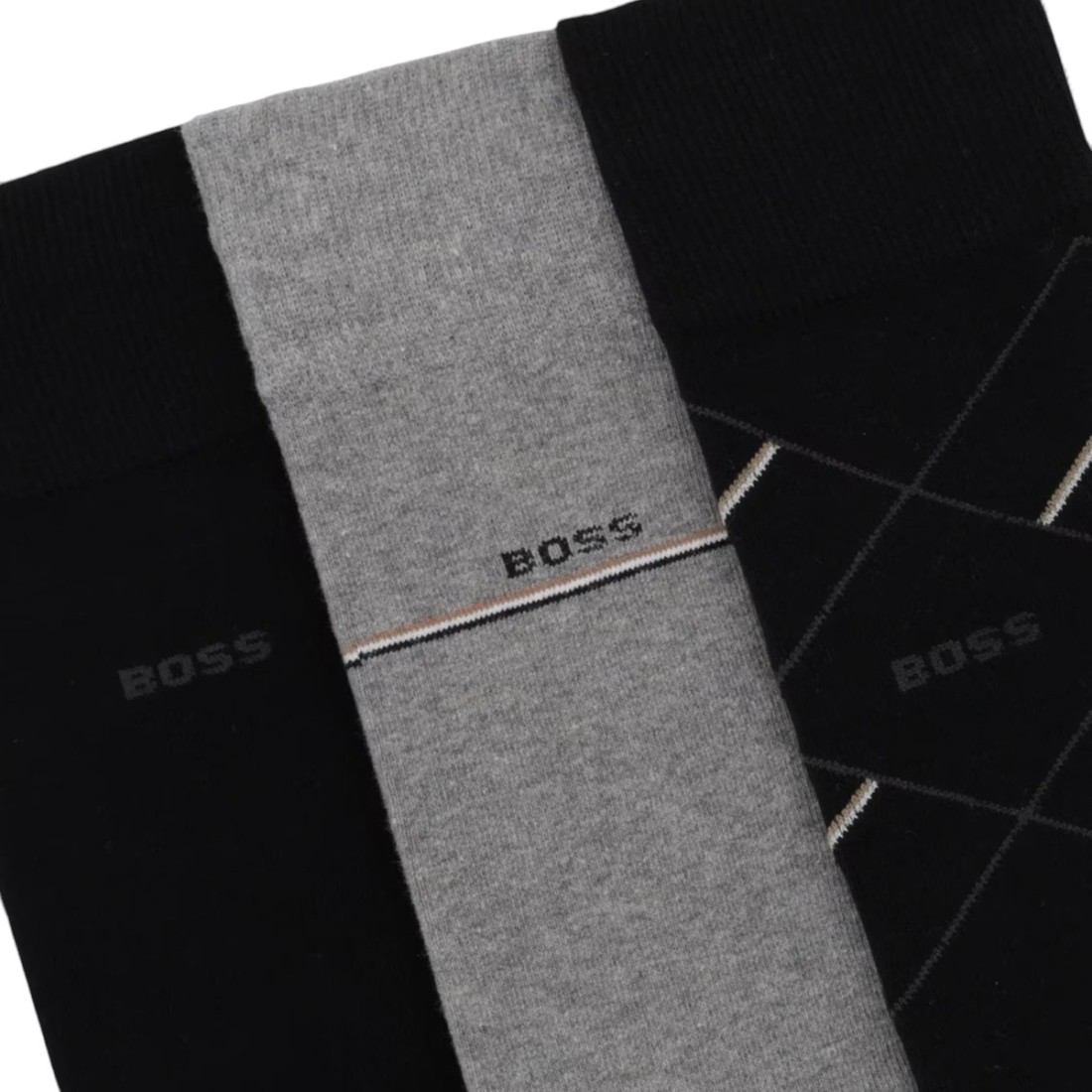 Trois paires de chaussettes BOSS pour homme, longueur classique, en coton doux et résistant. Motifs unis et à motifs avec logo discret. Talon et pointe renforcés pour une plus grande durabilité. Idéales pour une tenue confortable et élégante au quotidien.