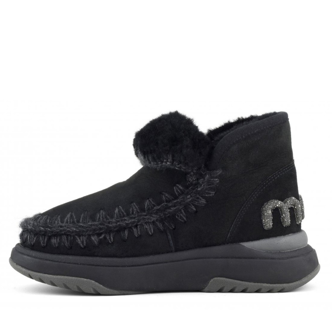 Découvrez les MOU trainers Eskimo jogger glitter logo en daim noir, avec des coutures en crochet et une doublure chaude en peau de mouton. Le logo Mou glitter à l'arrière ajoute une touche distinctive, tandis que la semelle en caoutchouc assure confort et durabilité pour un look authentique et raffiné.