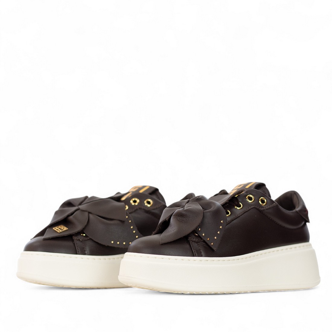 GIO+ - Baskets en cuir marron avec patch arrière en cuir ton sur ton. Accessoires amovibles sur les lacets et logo en lettres sur la languette. Semelle compensée en caoutchouc de 50 mm.Notre service client est disponible du lundi au samedi de 10h00 à 19h30