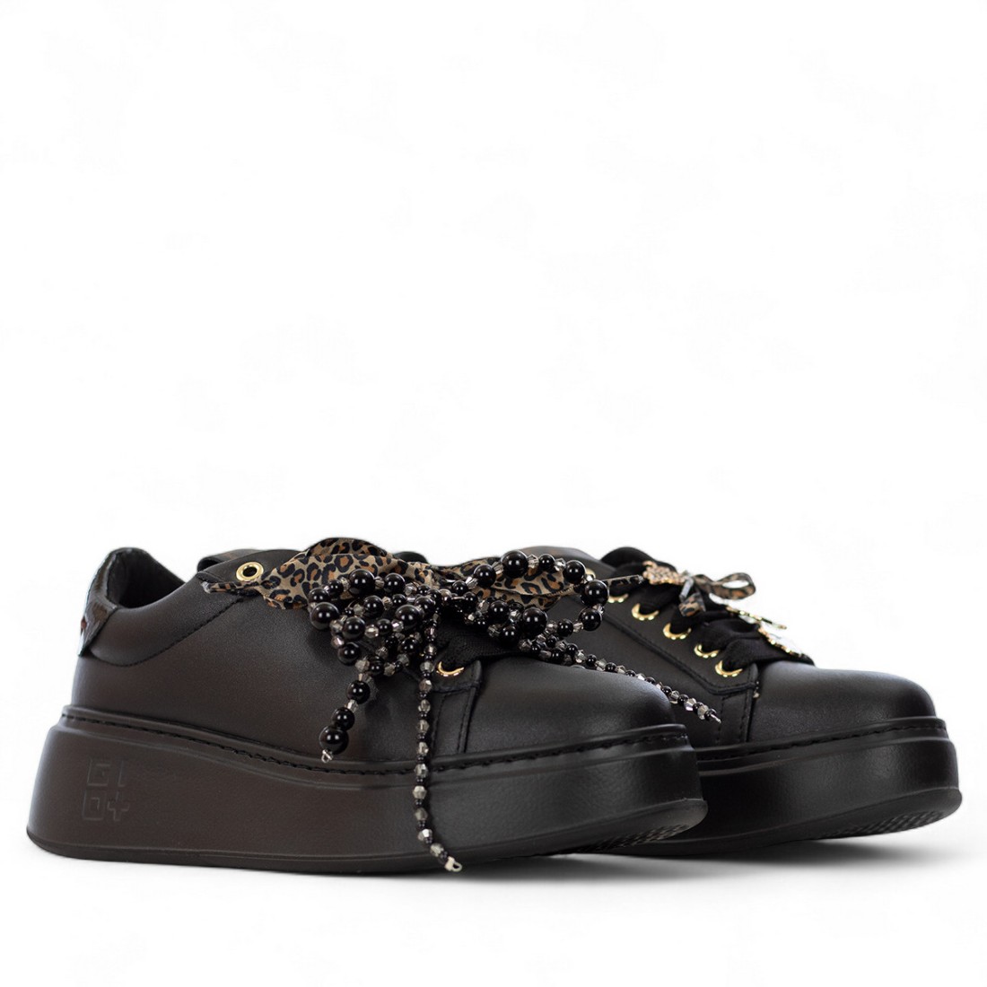 GIO+ - Baskets en cuir noir avec patch arrière en cuir verni ton sur ton. Accessoires amovibles sur les lacets et logo en lettres sur la languette. Semelle compensée en caoutchouc de 50 mm.Notre service client est disponible du lundi au samedi de 10h00 à 19h30
