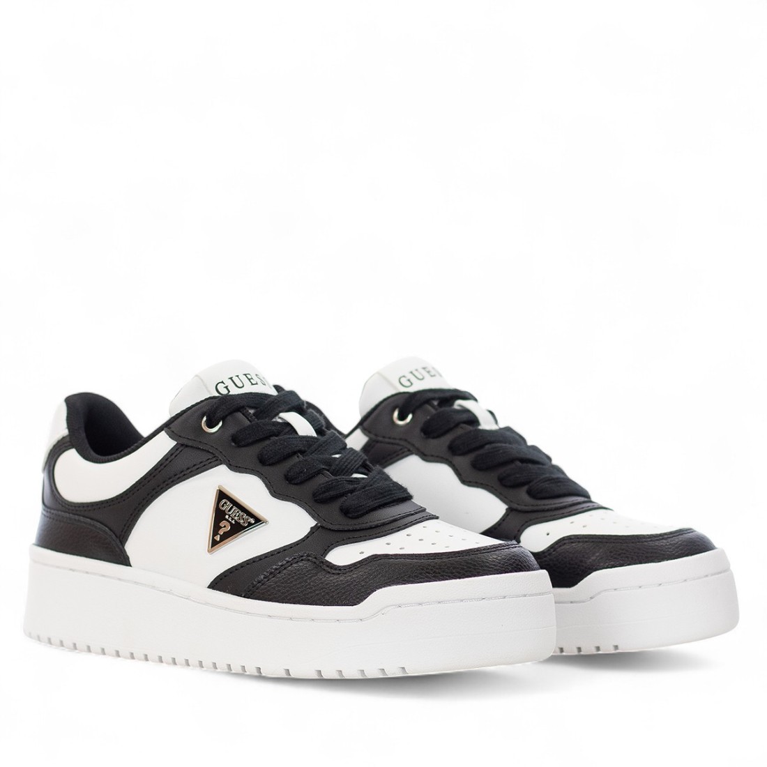 Baskets Guess en faux cuir noir et blanc, au design moderne et polyvalent. La doublure et la semelle intérieure en tissu assurent un confort tout au long de la journée, tandis que le logo embossé sur le côté ajoute une touche distinctive. La semelle haute de 30 mm et la semelle en caoutchouc assurent stabilité et style à chaque pas.Notre service client est disponible du lundi au samedi de 10h00 à 19h30