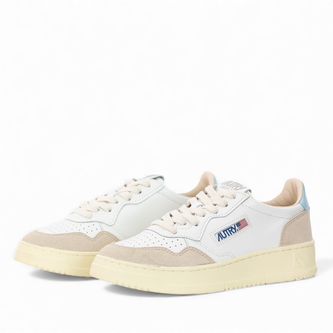 Autry Medalist est une chaussure de sport basse pour femme inspirée des modèles vintage des années 1980, réinterprétés dans une touche de modernité. Tige en cuir blanc et daim beige, bout perforé, lacets en coton et col rembourré garantissent confort et respirabilité. Talon bleu clair emblématique, semelle en caoutchouc de 2,5-3,5 cm, semelle intérieure surélevée de 2 cm. Doublure en cuir et coton.Notre service client est disponible du lundi au samedi de 10h00 à 19h30