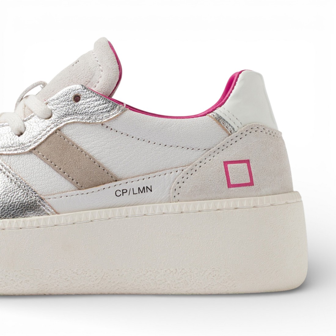 Les baskets D.A.T.E. allient style et confort avec une plateforme en cuir blanc et des détails argentés. Le laçage en coton et la languette avec logo en daim rendent chaque pas élégant, tandis que la bande latérale beige et le talon arrière en cuir brillant ajoutent du caractère. La doublure en cuir et coton éponge assure le confort, complété par une semelle en caoutchouc durable. Parfaites pour ceux qui aiment se démarquer avec style.Notre service client est disponible du lundi au samedi de 10h00 à 19h30