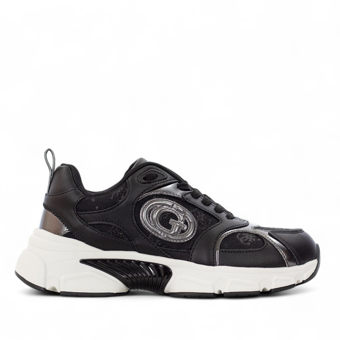 Baskets Guess en faux cuir noir avec empiècements en tissu décorés d'un imprimé monogramme ton sur ton. Doublure et semelle intérieure en tissu pour un confort optimal. Design moderne avec un bas de 50 mm de haut qui affine la silhouette. Semelle en caoutchouc durable pour une adhérence et une stabilité parfaites à chaque pas. Idéales pour un look décontracté et contemporain.Notre service client est disponible du lundi au samedi de 10h00 à 19h30